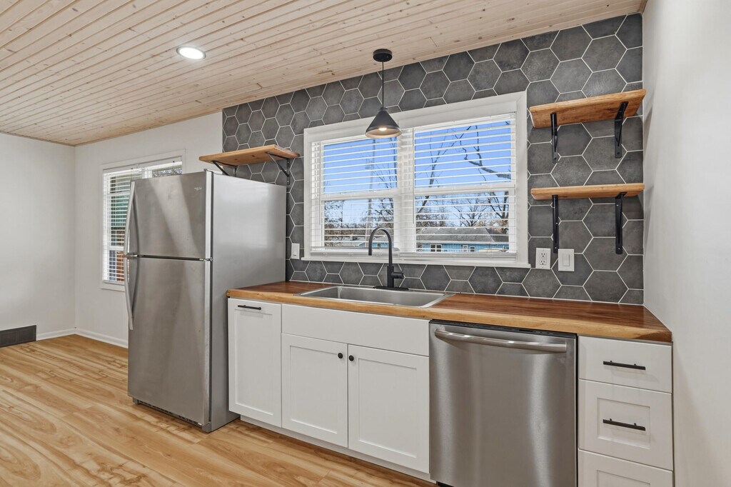 Take a look at this updated 3-bedroom,1.5-bathroom home available for rent at $1,925 per month. This home features hardwood floors throughout the living area and bedrooms,and an open layout between the kitchen and dining space. The kitchen is updated with white cabinetry,a decorative tile backsplash,floating shelves,stainless steel appliances,and great windows that provide plenty of natural light. The primary bedroom includes a conveniently attached half bathroom. Both bathrooms in the home have modern updates,with the full bathroom showcasing a tiled shower and glass slider door. Additional features include a 1-car attached garage and ample storage space in the unfinished basement. The property boasts a large fenced backyard,perfect for outdoor activities or relaxing. Pets are welcome,with a $300 non-refundable pet deposit per pet. Situated in a convenient location,this home is near shopping,dining options,and offers an easy commute to downtown and the University,making it an ideal spot for convenience and ease of living.