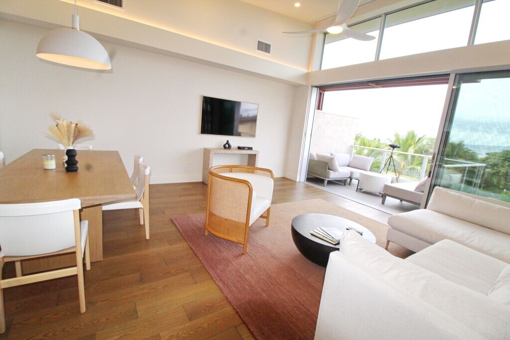 Makali'i is Wailea's newest resort style private gated community with 68 luxury 2 & 3-bedroom town-home residences, four homes per building, on just under 9.5 acres. This front row finely furnished 2 bedroom 2 bathroom mid-century modern design unit has expressions of Hawaiian Culture while pushing the boundaries of elegance and inspiration. Floor to ceiling & wall to wall glass showcasing ocean views from the kitchen, great room and private lanai. Enclosed garage with a sophisticated indoor-outdoor floor plan. Enter into your private entry courtyard and spacious lanais suited with UV treated dual glazed windows, energy efficient modern lighting, large sliding glass doors leading to the entry courtyard and lanais, Caesarstone countertops, walnut cabinets, and a large stackable washer/dryer. Extra comfort controls with heating, ventilation, and air conditioning (HVAC) using various technologies to control the temperature, humidity, and purity of the air for the enclosed spaces if you’re not enjoying the open air ocean breeze. The chef's kitchen calls for culinary creativity with Fisher and Paykel premium stainless steel appliances including a double door fridge, gas range, and a double drawer dishwasher. Amenities at the Residence Club feature a double water wall 100ft. infinity edged pool with shallow area for lounge chairs, Covered BBQ / culinary area with dining pavilions, ample seating and lounging opportunities, Indoor-outdoor fitness center featuring aerobic and weight equipment, health club and spa areas with wet and dry Saunas in both men and women's bathrooms, Entry water feature boasts a sculpture by the talented local Hawaiian artist Satoru Abe. Wailea Area is surrounded by lush tropical flora, Wailea’s Blue Golf Course, Short walking distance to Polo beach, minutes away from 4 other beaches, golf courses, schools, markets, and drug stores all conveniently located nearby. Top class restaurants located across the street at the Fairmont Kealani Resort Hotel within walking distance. Beautiful sunsets with opportunities to whale watch right from your kitchen, great room and lanai. Utilities will include water/sewer, basic cable, basic internet, standard trash removal, 1x a year exterior window and screen cleaning, landscaping, and complex amenities as provided by the HOA. Tenant(s) responsible for all other utilities including obtaining and maintaining renter's insurance. Available 7/1/26, 1 year term preferred for $8,250 a month. No pets please.
