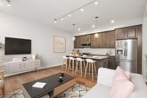 1 story ground level flat in the 6th Street Mews in desirable Neighborhood Launch. Spacious/ bright rooms with high end finishes throughout. Featuring: hardwood floors,versatile living space,south facing windows in living area (w/custom solar shades),eat-in kitchen with granite countertops,stainless steel appliances,gas range,full bath with tile flooring,granite countertop & spacious shower,primary bedroom with walk-in closet,custom black out solar shades,laundry/ utility closet with washer & dryer. Outside,private front patio in beautifully landscaped & gated shared courtyard,attached 1 car shared garage with dedicated parking space and room for storage. A great location and easy access to ALL Downtown destinations! Washer & dryer provided. Pets considered with deposit.
