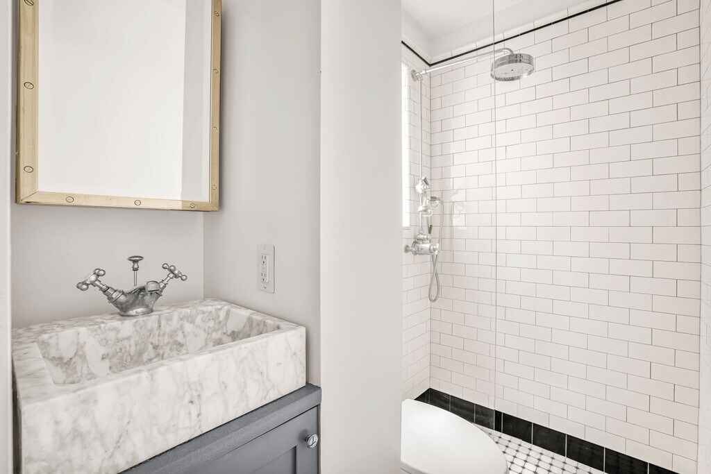 Nestled in the peaceful tree-lined blocks of SoHo, this is a one of a kind opportunity to rent in one of Manhattans most desirable neighborhoods. Apartment number 19 is a one-bedroom home boasting double exposures and a well outfitted chef’s kitchen. The space has been renovated with custom tile and modern stainless shelving throughout. The living room has two large windows that face east and get a great morning light. 9-Foot ceilings flash a modern pop of color that is welcome in this beautifully designed apartment.. A stainless Summit refrigerator/freezer along with a wine cooler provides ample cold storage, and a custom wall of drawers provides a gracious amount of kitchen storage. The kitchen also has a garbage disposal and water filtration system built into the sink. The windowed bathroom boasts a custom vanity with a marble sink, and is wrapped in fresh subway tiling. The bathroom holds a well appointed standing shower, with polished fixtures by Lefroy Brooks. Separated by a sturdy sliding door, the bedroom has a west facing window that offers wonderful afternoon light. The bedroom is large enough to hold a queen sized bed with nightstand and provides a peaceful, quiet retreat in the heart of SoHo. 101 Thompson Street is located directly adjacent to a city park, between Spring and Prince streets. This serene location has all of the best shopping, dining, and experiences that the city has to offer just steps away. The building is a boutique cooperative with a live-in super and an unrestricted subletting policy. Co-purchasing, gifting, pied-a-tiers and pets are all allowed. Just a short walk up to this paradise in the heart of SoHo. Rental Terms: Monthly: $4,675