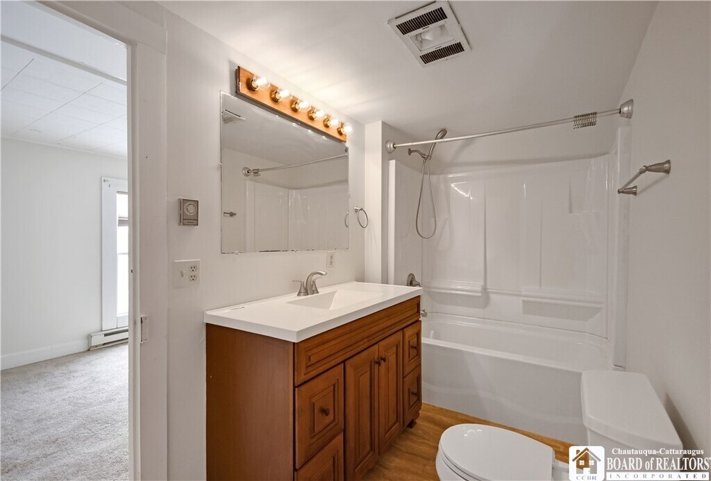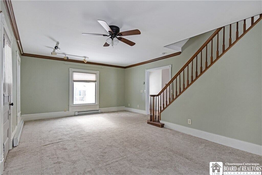 Single-family rental home with 3 bedrooms and 2 full baths. The kitchen is fully equipped with a stove/oven,dishwasher,microwave,and refrigerator,with hardwood floors in the kitchen and dining area. There’s a large dining room and a huge living room,offering plenty of space. The home features two enclosed porches—a front porch that works well as a three-season room and a side porch near the driveway. Both have updated windows,bringing in lots of natural light and helping with efficiency. A laundry area with a washer and dryer is included,along with a basement for additional storage. Outside,the driveway fits multiple vehicles,there’s a small garage for storage,and a large back deck overlooking a spacious yard. Conveniently located about 0.1 mile from the neighborhood park and approximately 0.25 mile from Chautauqua Lake.