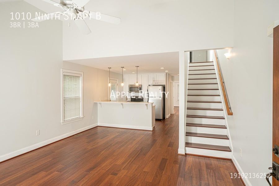 3 BR, 3 BA completely remodeled duplex close enough to walk and/or bike to Duke's campus. The property has hardwood floors throughout, kitchen includes stainless steel appliances with range, refrigerator, dishwasher, washer/dryer in laundry closet with shelving. Room length closets in the bedrooms (as seen in floor plan). Central heat & AC, Gas H2O, lawncare included.