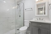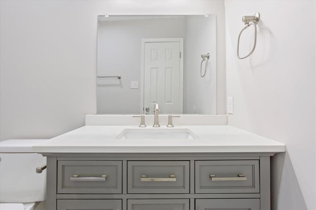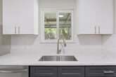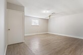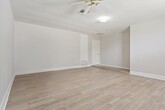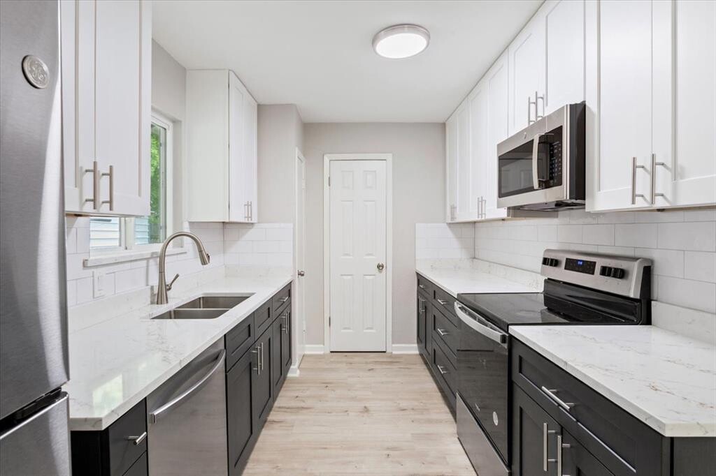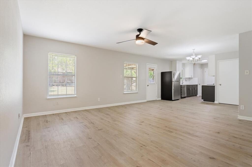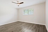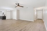 Recent renovation includes: new kitchen cabinets, kitchen quartz counters, light wood finished floors, stainless steel appliances including over the range microwave, kitchen tile backsplash. Renovated bathroom turned into walk-in shower with glass door, fresh interior and exterior paint, HVAC is only 3yr old, ample laundry room. All rooms and living area have recently replaced ceiling fans, large backyard includes good size storage.