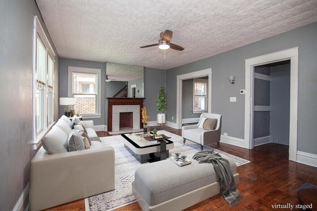 5 bedrooms (3 on 2nd floor, 2 more small bedrooms on 3rd floor), 1 and 1/2 bath unfurnished house with granite countertops, microwave, dishwasher, refrigerator, stove, hardwood floors, enclosed front porch, new furnace and central air conditioning (2023), high-efficiency windows throughout, fenced in back yard, parking area for 2 cars in back, decorative fireplace, and full unfinished basement for storage. Built in 1920, fully renovated in 2021, about 2000 sq.ft. Pets ok. Do not apply if you have any evictions in the past 5 years or are currently going through an eviction. Minimum gross income should be $5000 or more per month to qualify. See our website for answers to most questions at where you can also apply for the house. 5 bedrooms (3 on 2nd floor, 2 more small bedrooms on 3rd floor), 1 and 1/2 bath unfurnished house with granite countertops, microwave, dishwasher, refrigerator, stove, hardwood floors, enclosed front porch, new furnace and central air conditioning (2023), high-efficiency windows throughout, fenced in back yard, parking area for 2 cars in back, decorative fireplace, and full unfinished basement for storage. Built in 1920, fully renovated in 2021, about 2000 sq.ft. Pets ok. Do not apply if you have any evictions in the past 5 years or are currently going through an eviction. Minimum gross income should be $5000 or more per month to qualify. See our website for answers to most questions at where you can also apply for the house.