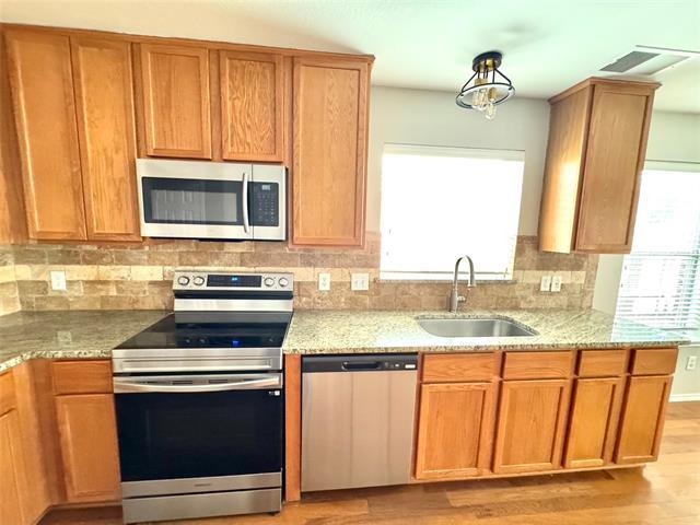 Frisco ISD!!! Move in ready! Open floor plan. New interior paint and carpet. New light fixtures. New dishwasher, Electric range is one year new. Kitchen has granite countertops and an island with breakfast bar seating. Kitchen and adjacent dining area flow into the living room with fireplace. Master bathroom features dual sinks, separate shower-tub. Bonus loft space connects to office through french doors. Close to golfing, Ash woods park, schools, supermarket and shopping center.