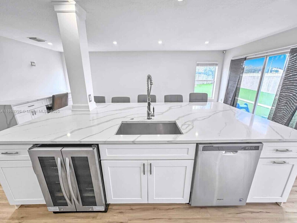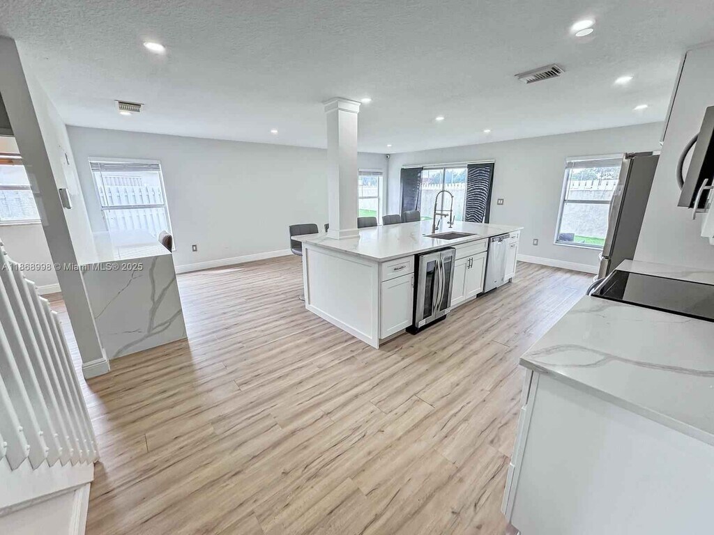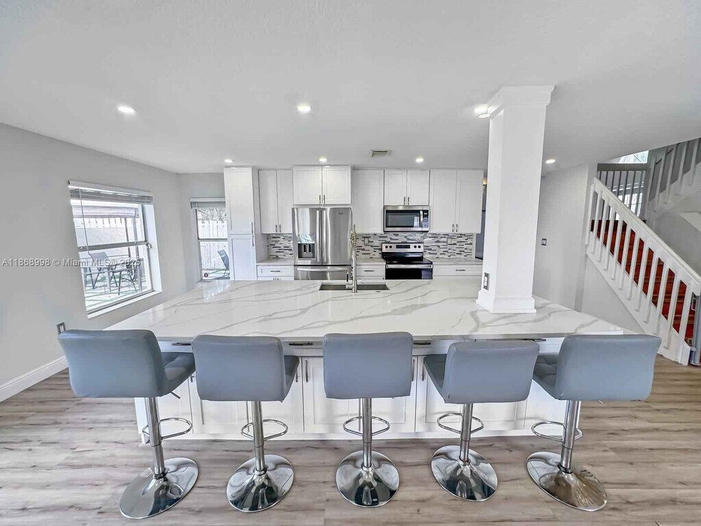 Beautiful home in Sunrise, near Sawgrass Mills Mall. Open floor plan with 4 bedrooms and 2.5 baths on premium 10,359 sq ft lot. Gorgeous remolded kitchen boasts modern white shaker cabinets and stunning quartz counters. Relax by the fire place in the expansive family room complete with stylish laminate flooring. Spacious primary suite has a large walk-in closet with a large en-suite bath. The oversized fully fenced backyard is perfect for entertaining. 2 car garage and driveway space for an additional 2-3 cars. Great location close to shopping, dining, entertainment and Flamingo Park. Pets considered with additional pet deposit.