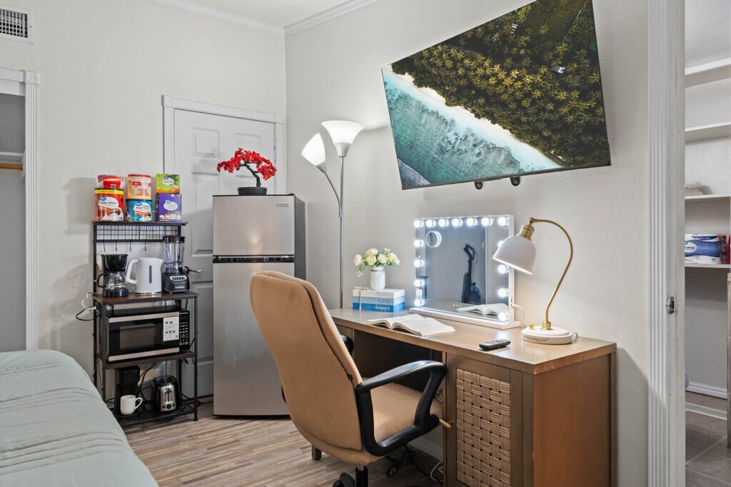Welcome to this home in Mount Helix, Spring Valley, San Diego, one of East County’s most sought-after communities. Nestled in the rolling hills, this neighborhood is known for its peaceful cul-de-sac streets and scenic mountain views. Feel at home in this quiet suburban retreat with quick access to nature, shopping, and entertainment. This studio is stocked with a coffee machine (drip coffee and Keurig), fridge, microwave, toaster, blender, water kettle, and essential dinnerware. You can enjoy Smart Roku for Netflix, YouTube and Disney+. The bathroom is fully stocked with a walk-in shower, shampoo, body wash, a hairdryer, and fresh towels. One large assigned parking space is available. Pets are welcome. Unlike busy city centers, Mount Helix San Diego offers guests a quiet suburban retreat with quick access to nature, shopping, and entertainment. Just minutes away, you’ll find shopping centers, grocery stores, coffee shops, and restaurants. Mount Helix San Diego is well connected to the most popular parts of San Diego County, including Downtown San Diego and the Gaslamp Quarter (20–25 minutes), San Diego International Airport (25–30 minutes), La Mesa Village (10–15 minutes), Mission Valley/Fashion Valley Malls (20 minutes), Balboa Park and San Diego Zoo (25 minutes), Pacific Beach and Mission Beach (30–35 minutes), Coronado Island (30 minutes), and Julian Mountain Town (40 minutes). One security camera records the activities of the pathway from the driveway to the front door 24/7 to protect the guests and the home. One noise decibel monitor outside the house measures the noise level 24/7 to prevent prolonged noise and doesn't record any audio. Fast 500 Mbps Wi-Fi makes hosting an online meeting or sharing a large file easy. [SI]