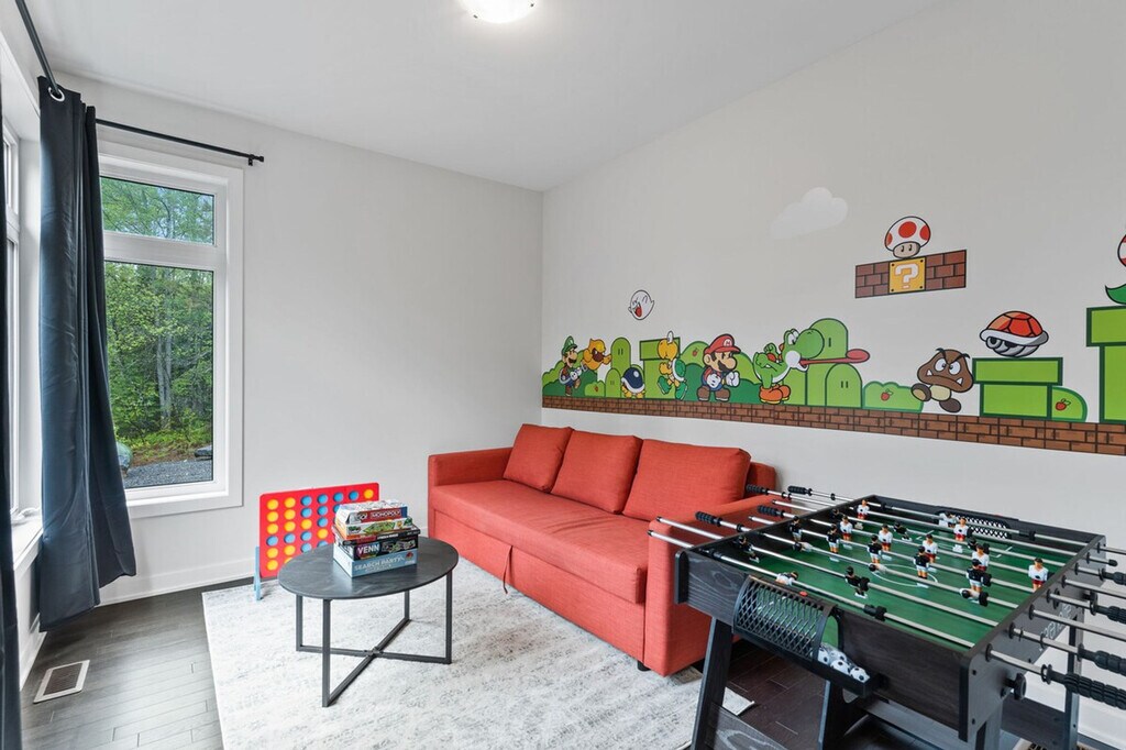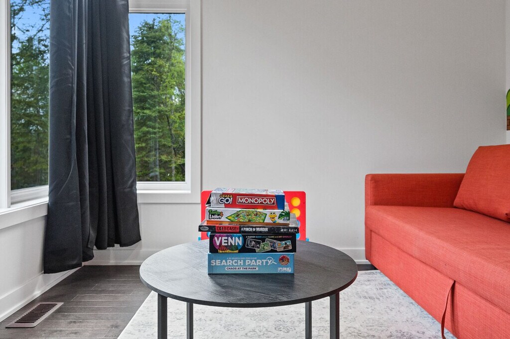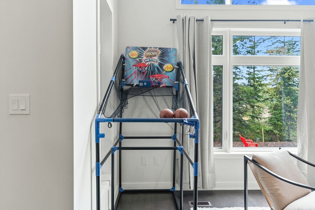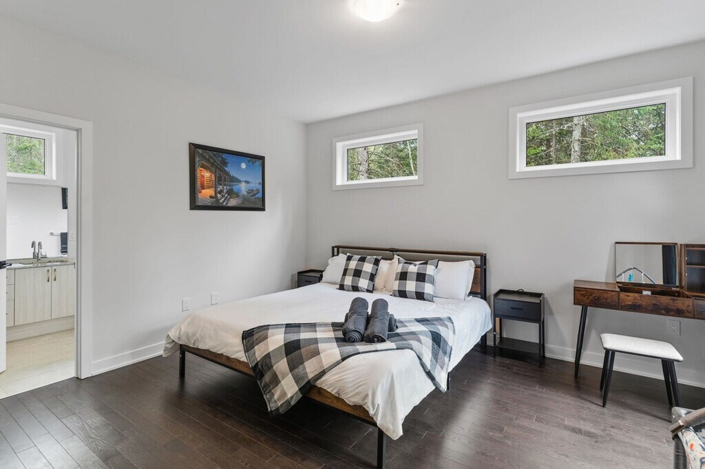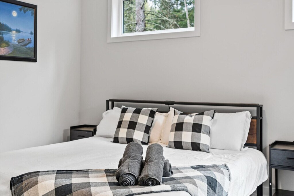 Feel at home in this spacious, family-friendly cottage in Lake of Bays, surrounded by peaceful woods and scenic trails. This is the ideal getaway for families, friends, or couples looking to unwind and enjoy Muskoka. The backyard is your go-to space for reconnecting with nature and spending quality time with loved ones. This open-concept cottage, built in 2024, features soaring vaulted ceilings and floor-to-ceiling windows, flooding the space with natural light and views of the pines. Enjoy the fully screened Muskoka Room with a cozy fire table, a games room with cinema lighting, air hockey, foosball, and indoor basketball. The fully equipped kitchen comes with all essential cooking appliances, a dining table for family meals, and patio seating for sunny breakfasts. There is also a classic table tennis set-up for a dose of fun. Nearby parks include Limberlost Forest & Wildlife Reserve, Arrowhead Provincial Park, and Algonquin Provincial Park (15–20 minutes away). More nearby attractions include Deerhurst Resort (10 mins) and Dorset Lookout Tower (10 mins). Downtown Huntsville is 15 minutes away. Enjoy canoeing, kayaking, and motorized water sports, all within 10 minutes. There are seasonal farmers markets and local events just around the corner. There is a noise monitoring device installed in the unit that tracks volume decibels; the device does not record audio to ensure privacy. There is a strict no smoking and no party policy; violations of these policies will result in a $1000 fine, respectively. Toilet paper, garbage bags, and basic toiletries will be provided for the guests at the beginning of the stay; it will then be the guest's responsibility to provide these for the remainder of their stay. We have hired people to shovel the private driveway during winter, and the main road is plowed by the city; however, we are not responsible for any issues with ice and snow on the driveway or on the road itself. Winter weather can be unpredictable in Muskoka; for your convenience, please be prepared to shovel if needed. We will try our best to keep the propane filled, but guests will need to visit the gas station 10 minutes away if it is empty.