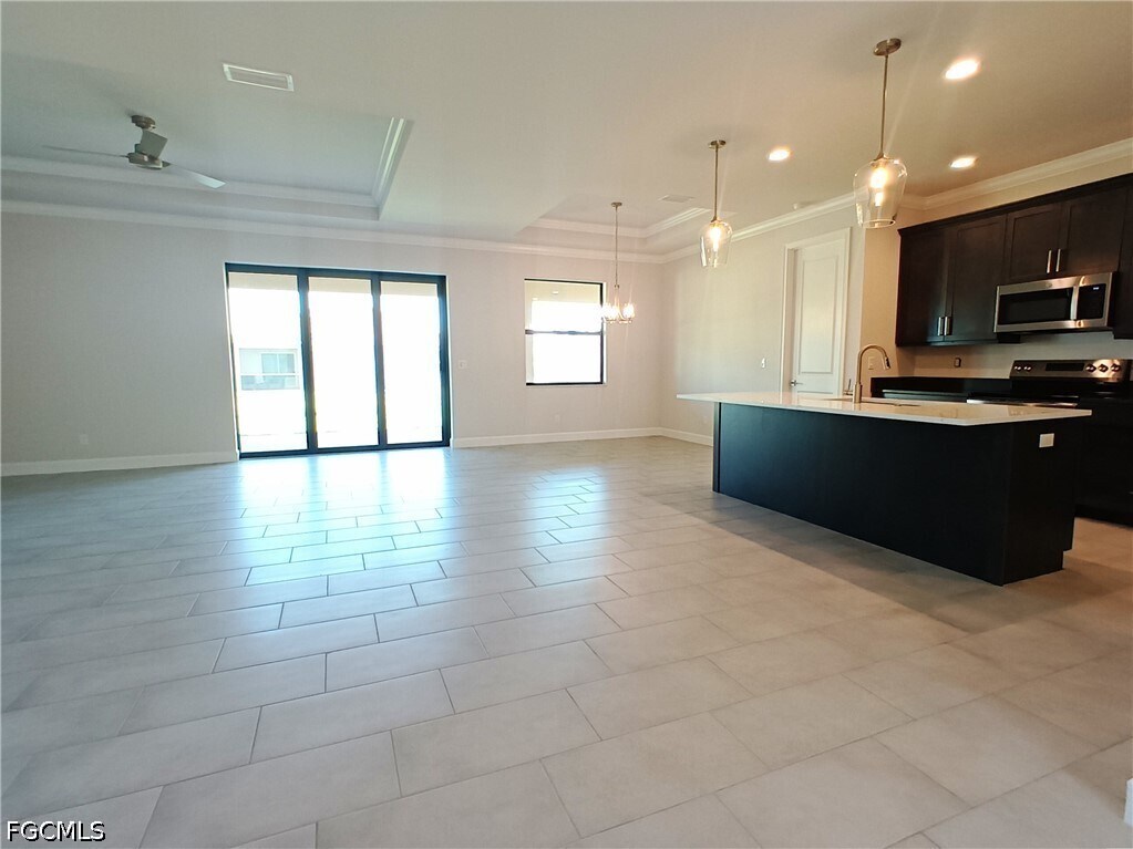 Just days away from receiving its Certificate of Occupancy,this brand-new construction home at 1017 SW 33rd St presents a rare opportunity to be the very first occupant of a thoughtfully designed residence in the highly desirable Southwest Cape Coral area,situated on a spacious corner lot. This 3-bedroom plus den floor plan offers a true 3-car garage and features quality upgrades throughout. The interior showcases tile flooring throughout,high ceilings,and coffered ceiling details with crown molding that add depth and character to the main living areas. The kitchen is well-appointed with upgraded cabinetry,granite countertops,and stainless-steel appliances,all seamlessly flowing into the open-concept great room. The primary suite is designed for comfort,featuring high ceilings,a large walk-in closet,and a well-appointed bathroom with dual sinks,a private water closet,and an oversized walk-in shower. The additional bedrooms and den provide flexibility for a home office,guest space,or additional living area. Outdoor living is highlighted by a large under-truss lanai with pavers,ideal for relaxing or entertaining. The property also includes a full sprinkler system for easy lawn maintenance,with lawn care and pest control included. This is a unique opportunity to lease a brand-new home with upgraded finishes,ample space,and a prime location in Southwest Cape Coral. Schedule your private showing today.
