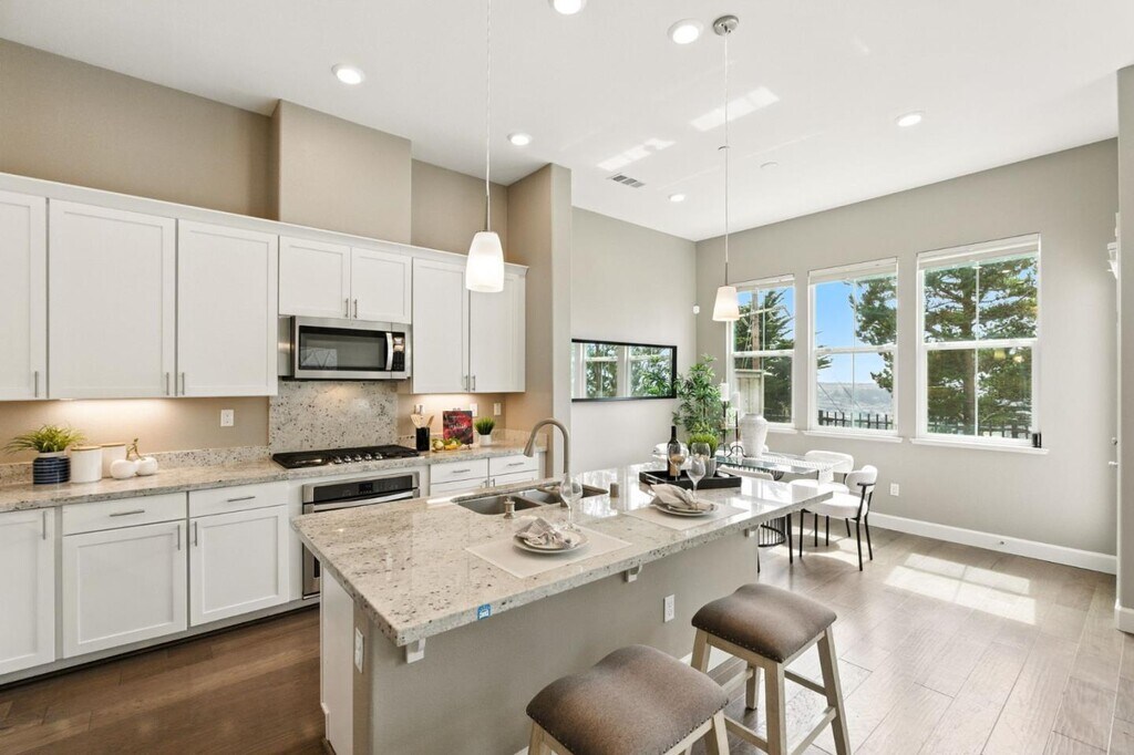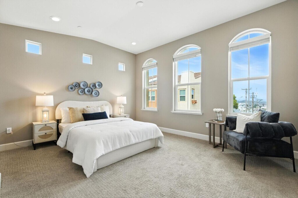Nestled atop the scenic hills in a gated community, this exquisite 3 level single-family home combines security, privacy, and breathtaking city & bay views. A spacious 4- bedroom, 4 bath home is offering 2,226 square feet of comfortable living space with modern design, abundant natural light, and thoughtful layout. It has luxury carpet throughout, custom window shades, and large, picturesque windows that frame stunning views. The kitchen is equipped with a large island with stone countertops, professional-grade appliances, modern cabinetry, and lovely windows with sunset views. The second level offers a master suite retreat with a grand, spa-like bathroom, including a double vanity, a walk-in shower, and a walk-in closet. This level also includes two additional bedrooms, one bathroom, and a full laundry room with a washer and dryer. The second level offers a master suite retreat with a grand, spa-like bathroom, including a double vanity, a walk-in shower, and a walk-in closet. This home is perfect for comfortable living and entertaining, just minutes from city conveniences and serene nature