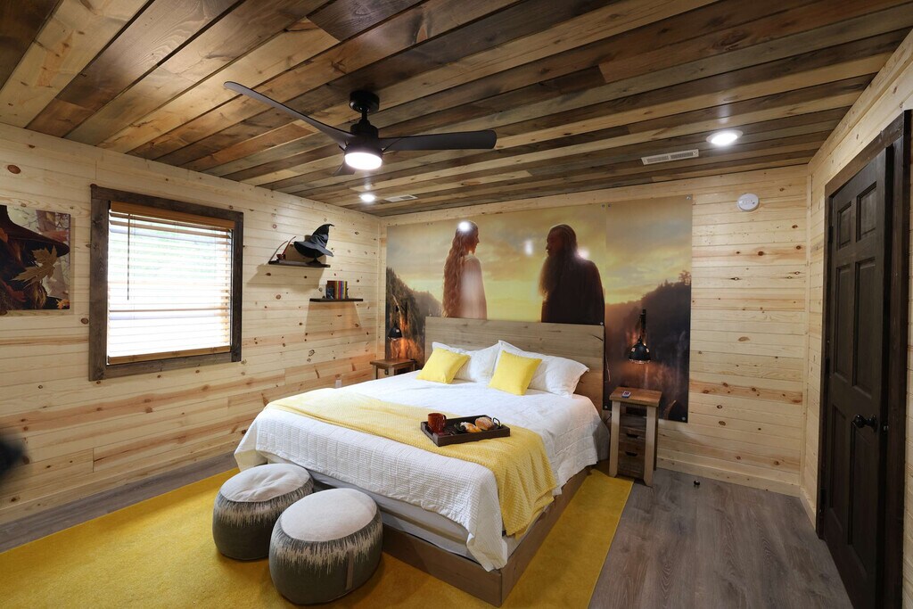 Welcome to Gandalf's Getaway, an enchanting Lord of the Rings-themed cabin in the heart of Sevierville. This magical retreat features four themed king bedrooms and two themed bunkrooms, immersing you in diverse Middle-earth settings. Enjoy a private theater, an indoor heated pool, and an arcade for year-round entertainment. Relax in the outdoor gazebo firepit and hot tub, all while taking in stunning mountain views. Located just 15 minutes from Pigeon Forge and Dollywood, and 30 minutes from GSMNP, this cabin offers seclusion with easy access to nearby attractions. Step into Treebeard’s Living Room, where you can unwind in comfortable, art-adorned spaces with board games, a 4K Smart TV, and a gas fireplace. Beorn’s Kitchen & Dining area invites you to create feasts with gourmet facilities, including a crockpot and coffee maker. The Fellowship Arcade offers classic digital board games and pool tables, surrounded by vibrant Lord of the Rings artwork. Each king room provides luxurious themed decor, from Elven elegance to Hobbit home vibes, ensuring a whimsical stay. The cabin includes a BBQ grill and a spacious lawn and patio for leisurely evenings under the stars. Nestled on a tranquil gravel road, this cabin offers breathtaking mountain views and is conveniently located near Pigeon Forge, Dollywood, and Tanger Outlets. Within a 15-minute drive, you'll find thrilling attractions and activities in Pigeon Forge, Gatlinburg, and Sevierville. The surrounding area boasts numerous outdoor activities, including hiking, ziplining, horseback riding, and visits to wineries and breweries. Excellent restaurants catering to diverse tastes ensure a memorable experience for everyone. Check-in is after 4:00 PM and check-out is before 10 AM. The cabin is non-pet-friendly and smoking indoors is not allowed. Safety is a priority, with smoke detectors, carbon monoxide detectors, and fire extinguishers equipped for peace of mind. Situated in a rural area, public transportation options are scarce, so it is advisable for guests to bring their own vehicles. [SI]