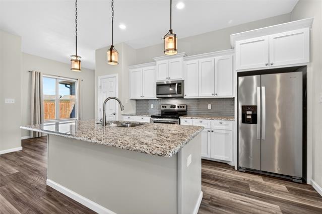 Beautiful 4 bed 2 bath home with 2 car oversized garage. This home features an open floor plan with a split layout. The kitchen is complete with custom cabinetry, granite counters, and stainless appliances. Eat in kitchen and additional dining space could be used as home office. Spacious living area with wood burning fireplace. Large master bedroom with en suite bathroom, separate shower and garden tub, large walk in closet. Spacious secondary bedrooms. Mud room and laundry room with built in cabinetry and granite folding table. Large backyard space with 8' privacy fence. Covered front and back porches. Come view this stunning home today! This home is offered for lease at $2,300 per month, with a $2,300 security deposit. No pets and no smoking are permitted. $45 application fee per adult. Applicants should review all Tenant Selection Criteria in the Transaction Desk prior to applying.