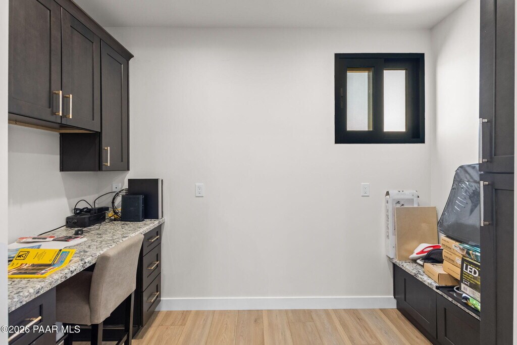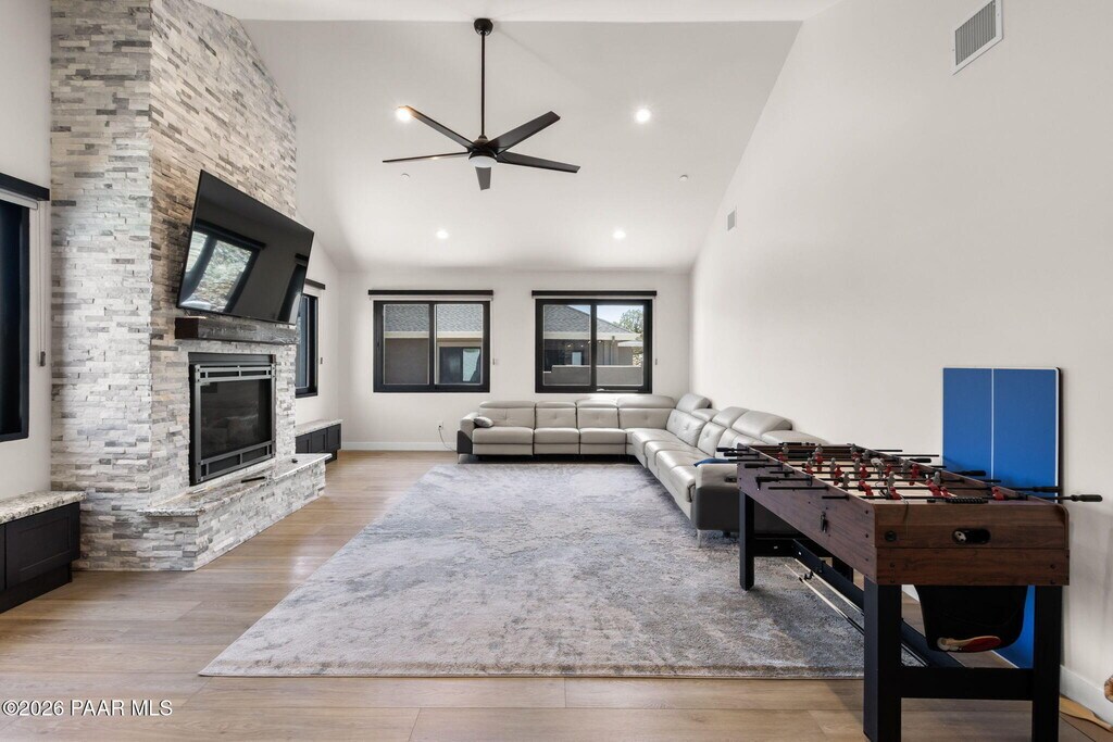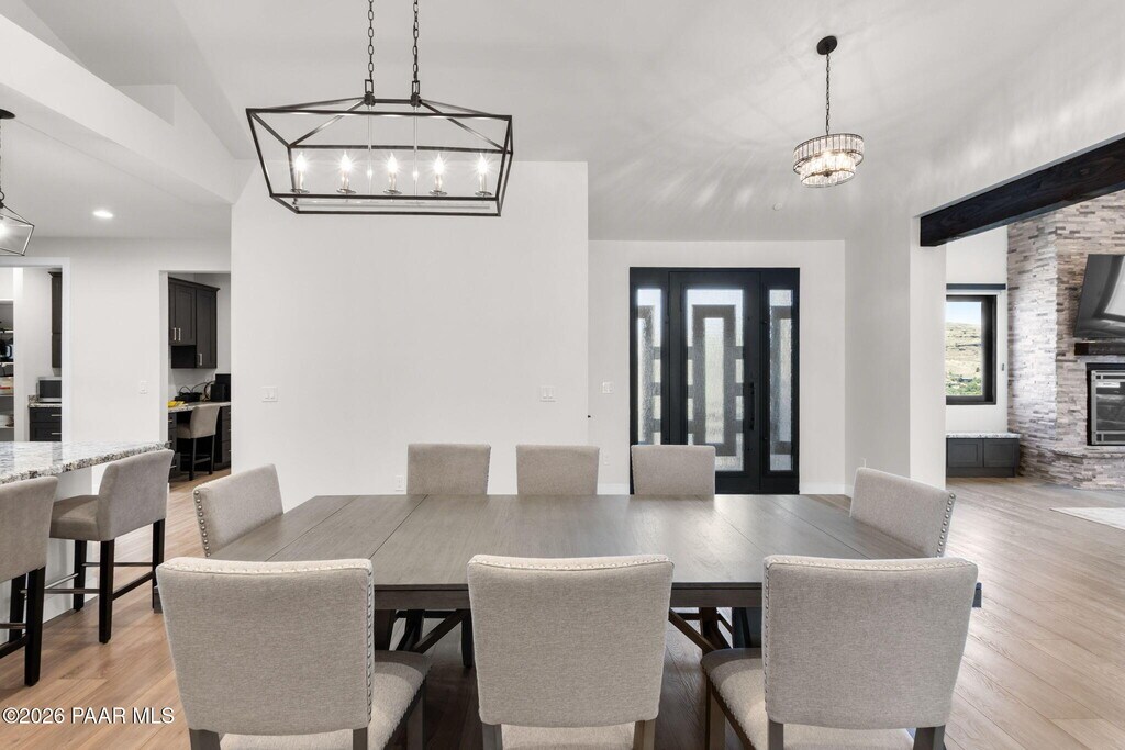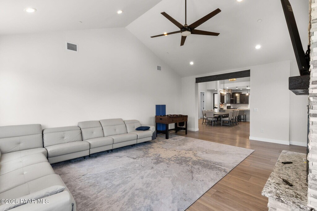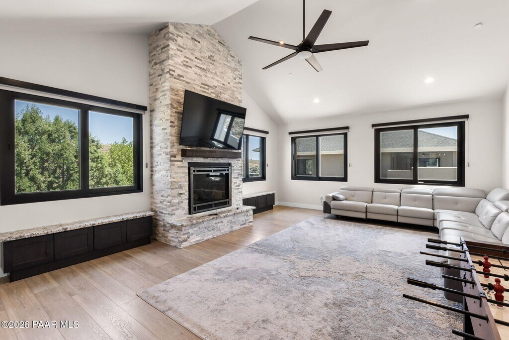 This impressive brand new construction residence graces the sought-after Yavapai Hills community with its abundance of luxury and functionality amenities featuring 3 car attached garage,4 bedrooms and 3.5 bath. From the moment you step inside,you're greeted by a custom rich iron door and a light-filled great room boasting high ceilings and a dramatic floor-to-ceiling stone fireplace in the family room creating an inviting & elegant atmosphere. Single-level living split floor plan,this home is designed with an open concept that floods the space with natural light,designer upgrades throughout including beautiful high end laminate flooring that complements the neutral designer paint scheme,Hunter Douglas blinds and custom bathroom tiles.