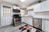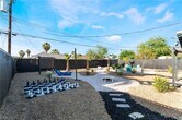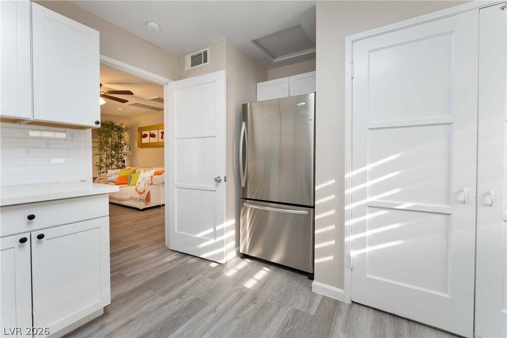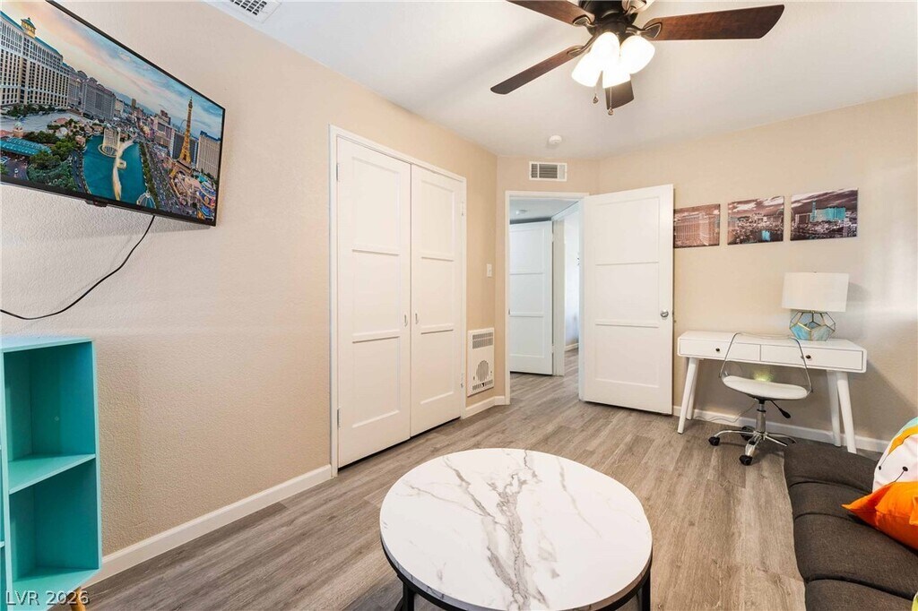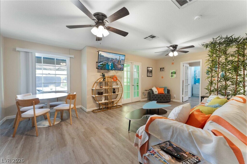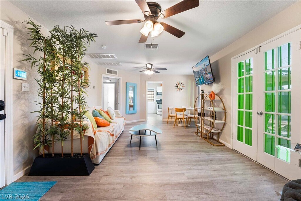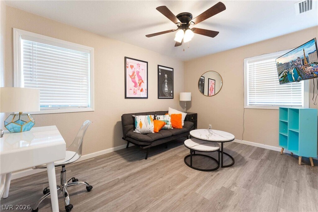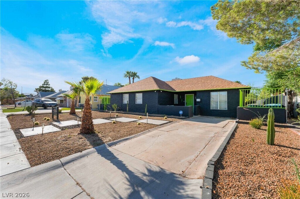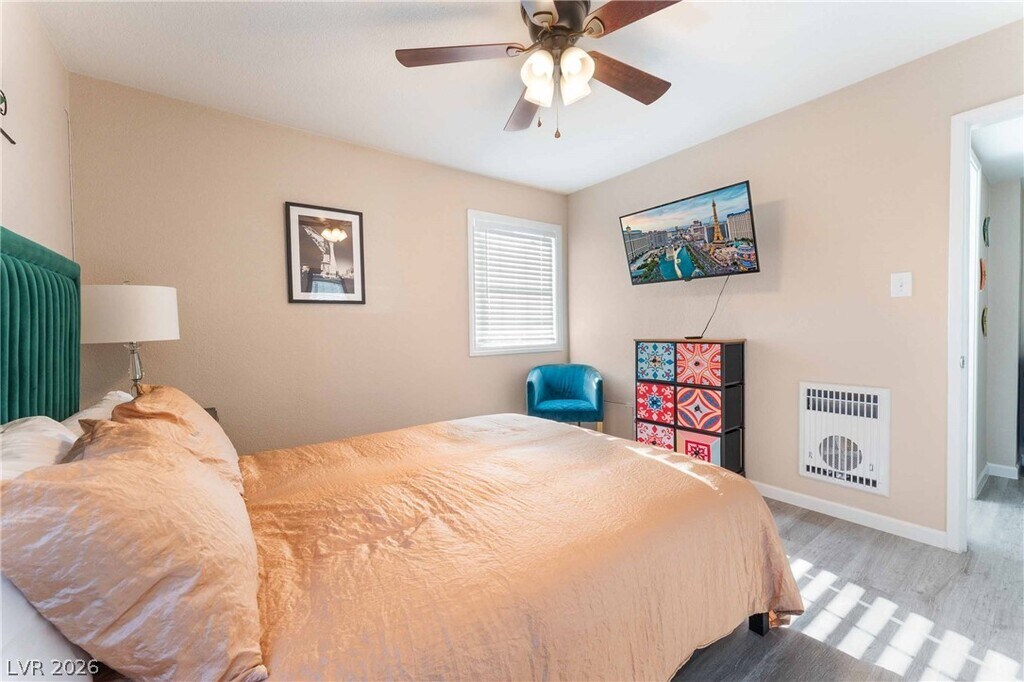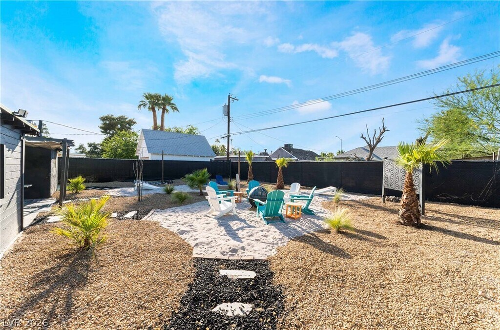 Positioned in a prime downtown Las Vegas location, this thoughtfully upgraded home delivers convenient access to major freeways, dining, and entertainment while offering a comfortable retreat from the city. Inside, modern flooring flows throughout, complemented by a contemporary kitchen featuring stainless steel appliances, crisp white cabinetry, and quartz countertops. Ceiling fans in every room enhance year-round comfort, while the primary suite is filled with natural light and includes a private en-suite bath. Two additional bedrooms provide generous storage and share a well-appointed secondary bathroom. The backyard is designed for both relaxation and entertaining, showcasing low-maintenance desert landscaping, a covered patio area, firepit, and outdoor recreation space, along with an included security system with panel and cameras for added peace of mind.