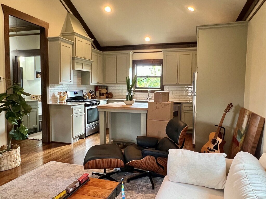 Rae Lynn WhiteBeautifully designed, recently-built garage apartment located in the heart of the Houston Heights. This spacious (900 sq ft) two-bedroom, one-bath home features soaring high ceilings and rich wood floors throughout, creating a bright and inviting atmosphere. The open-concept kitchen is completely accessible to the living area and features a large island, granite countertops, abundant cabinet and counter space. Both bedrooms offer generous walk-in closets, while the bathroom is also nicely finished. Enjoy outdoor living on the enormous private balcony, with a full-size washer and dryer conveniently located in the adjacent laundry room. Additional features include a private fenced backyard, and one assigned garage parking space. Landlord takes care of the lawn, and also pays for gas and water. A unique lease opportunity in one of Houston s most desirable neighborhoods. This spells HOME!