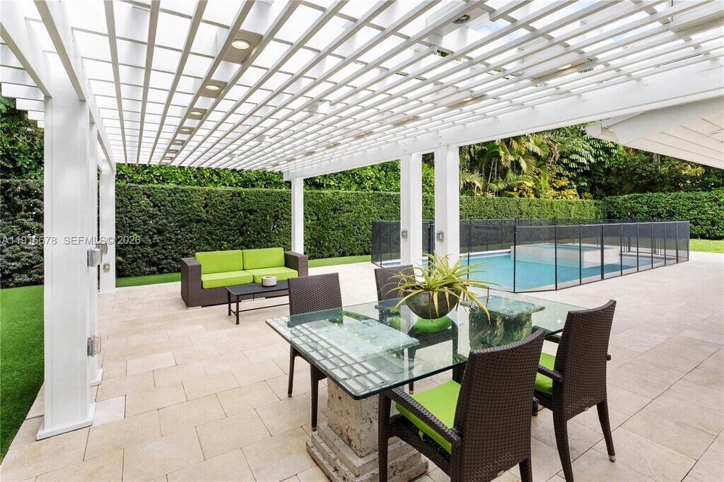 Beautiful home South Gables home! Features private yard w/ heated pool & hot tub, limestone deck, pergola, gorgeous landscaping & sprinkler system. All doors & windows are impact. Chef's kitchen w/ high end stainless steel appliances, large walk-in pantry, eat in-kitchen, wet bar, large living/dining/family room area, cabana bath, recess lighting & plantation shutters. 2 car garage is impact, insulated & under a/c. Master features walk-in cedar closet & on suite w/ tub and large walk-in shower. Available furnished too. MLS # A11916678