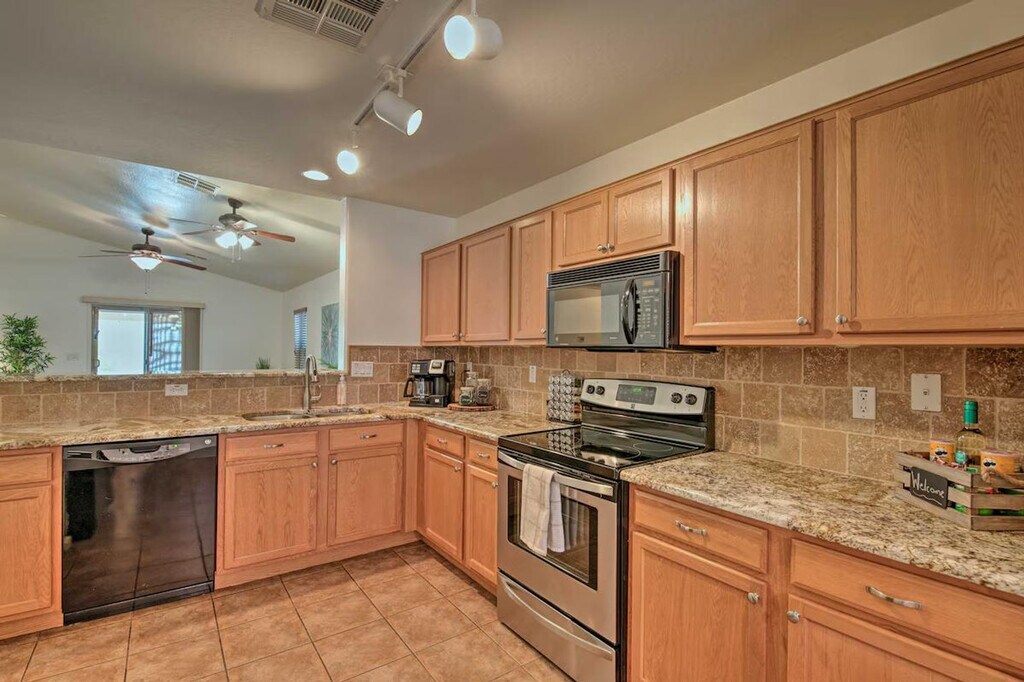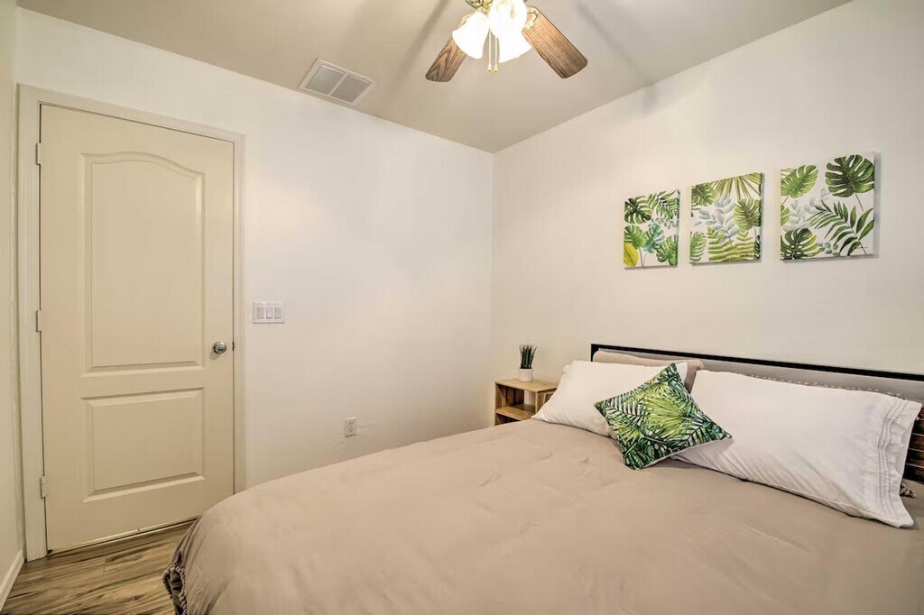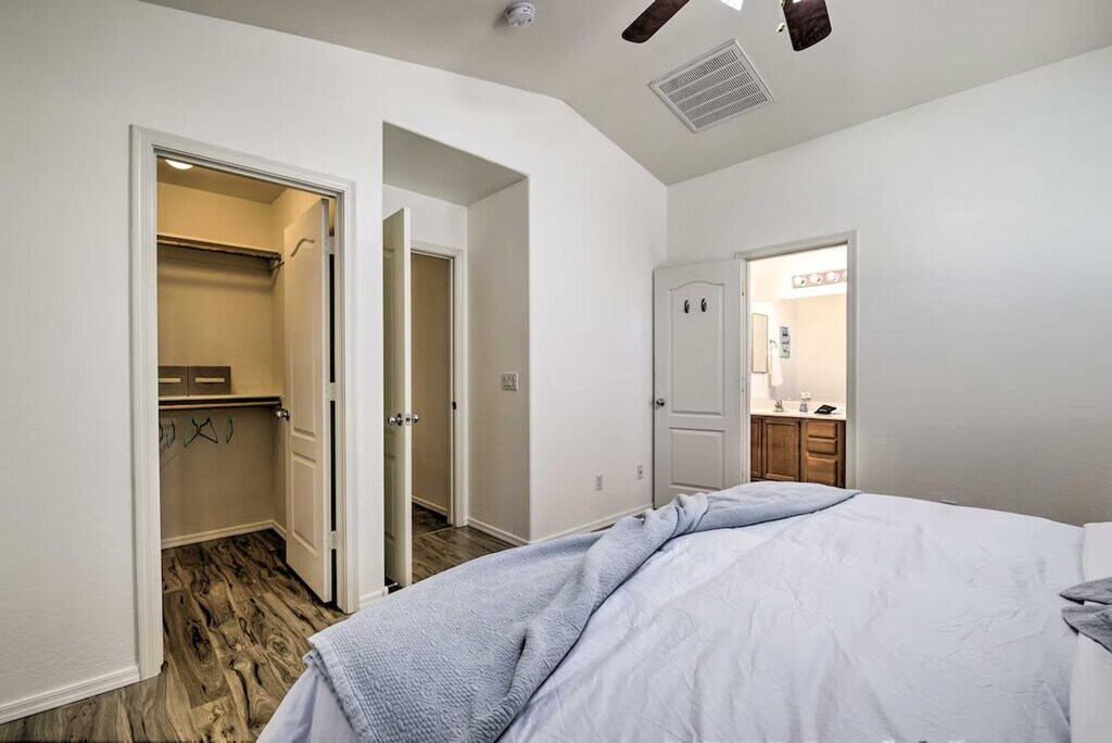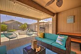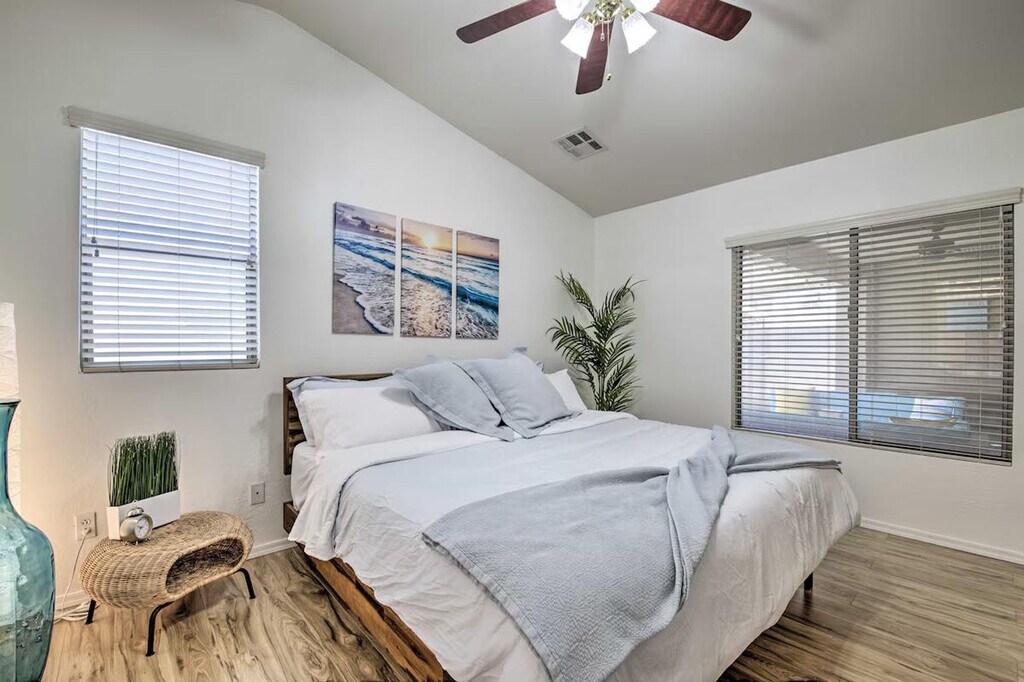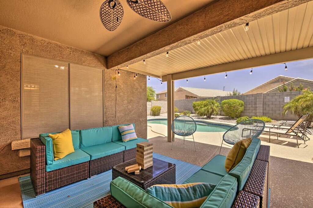 The advertised rate of $3,680/month is the lowest available price, based on a 30 day(s) stay with a move-in date of March 31, 2026. Rates vary depending on the duration of stay, season, and other parameters. For exact pricing and additional pricing components, please visit our website and enter your desired move-in and move-out dates. The rate is applicable when billed upfront; it can be higher if billed in multiple payments. Feel at home in this beautiful vacation rental in Goodyear, offering 3 bedrooms and 2 bathrooms. This house is the ideal Arizona escape for you and your loved ones. This house features a fully equipped kitchen, a smart TV, a dining table, a laptop-friendly workspace, board games, ceiling fans, a walk-in closet, a washer and dryer, linens and towels, keyless entry, central heating and air conditioning, complimentary toiletries, and an iron and board. The fully equipped kitchen includes a microwave, blender, toaster, drip coffee maker, single-cup coffee maker, cooking basics, dishware and flatware, spices, and a breakfast bar with 4 stools. Enjoy the private pool, hot tub, beach chairs, beach towels, pool toys, string lights, and a covered patio with a gas grill and Jenga. Garage parking is available for 2 vehicles, and driveway parking is available for 2 vehicles. Located close to spring training stadiums and beautiful parks, this well-appointed vacation rental serves as an excellent home base for outdoor enthusiasts and casual tourists alike! Hike the wilds of Estrella Mountain Regional Park, which is approximately 5 miles away, or check out spring training at Goodyear Ballpark. Endless exploration awaits at this lovely abode, just 24 miles from the sights and sounds of downtown Phoenix. This property may not be suitable for young children due to the unfenced pool area. The pool cleaner comes every Friday and may be present during your stay. [SI]