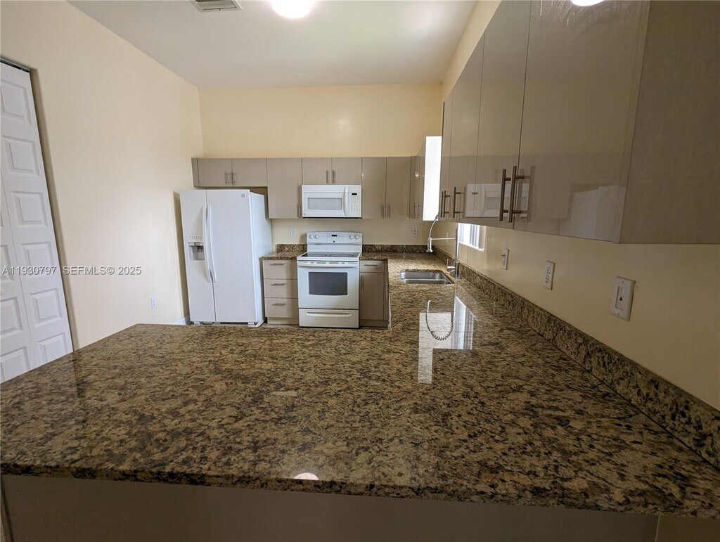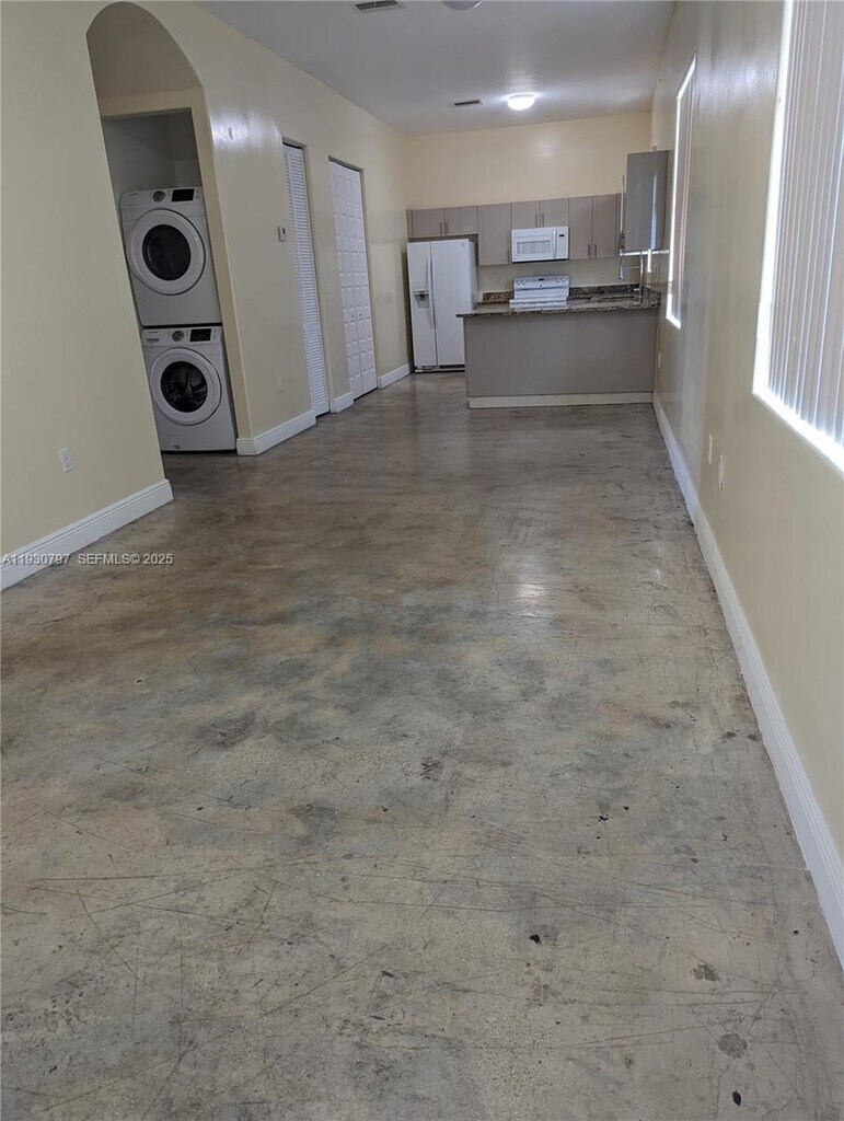 Amazing 3 Bed, 2 Bath Triplex Gem. New construction boasts airy open plan, granite countertops, New polished concrete floors, also includes very beautiful Italian Kitchen cabinets with new appliances. Freshly painted. Impact windows enhance security and treatment of them are in excellent condition, while lofty ceilings add grandeur. Super very convenient washer/dryer inside the unit. New A/C that is only two years old. Assigned parking space Nestled in family-focused locale with easy transit access. The location of the building is unbeatable, right next to restaurants, supermarkets, shopping center, hospital and much much more.