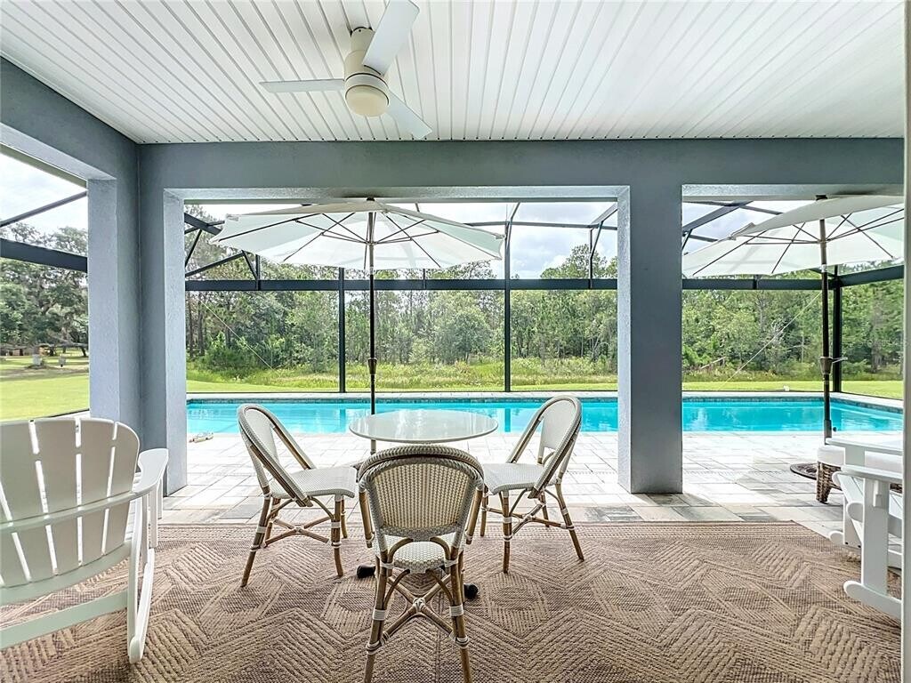 Beautiful and meticulously designed,this fully furnished country guest house in the heart of Groveland is everything you need to experience country living at its finest. The home sits on 30 acres which offers many recreational activities for you to enjoy such as a putting green,a target range,a mushroom garden,a fruit orchard,and a common pavilion where you can enjoy an outdoor bbq or relax and watch the beautiful sunset with a refreshing drink. Relax on the outdoor lounge chairs next to the fire pit on cooler evenings and enjoy the surrounding nature as you may spot some cranes or deer walking around. Inside the home,you will find beautiful high end furnishings and four poster beds designed for ultimate comfort. This home also includes a solar powered heated lap pool which is always ready to use with the perfect temperature. You will also find furnishings on the pool lanai which includes an area for dining and lounge chairs perfect for taking in the tranquil forest streching through the entire property. Rent includes electricity,water,lawn,and internet. Maid service every two weeks is also included with the rent. Salt treatment tanks for house water. Perfect for an adult couple or a single professional. No pets allowed. Short Term lease available. MLS# O6393810