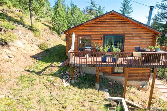 Experience true mountain living in this charming log home on over two private acres in Conifer, CO. Perched above the other homes on Blue Sky Trail, this property offers breathtaking, unobstructed views of the foothills and ultimate privacy. The oversized three-car garage provides ample storage for vehicles, outdoor gear, or a workshop. Inside, the open-concept living, dining, and kitchen area is perfect for entertaining, with stainless steel appliances in the kitchen, a cozy fireplace in the living room, and expansive windows that flood the space with natural light. Step outside onto the wrap-around deck to take in the sweeping vistas or access the functional flat yard, ideal for kids, dogs, or outdoor gatherings. Upstairs, you'll find two spacious bedrooms and a full bathroom with a skylight, adding warmth and brightness. The walkout basement features a third bedroom, another full bathroom, a laundry room, and a flexible living space that can serve as a home office, gym, additional living room, or entertainment room. A wood-burning furnace in the basement living area provides an efficient and cozy heat source during the colder months. This home offers the perfect blend of rustic charm and modern convenience, located just minutes from grocery stores and restaurants in Aspen Park and Conifer, and only 35 minutes from Denver. Single Family Residence MLS# 1938668