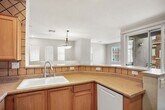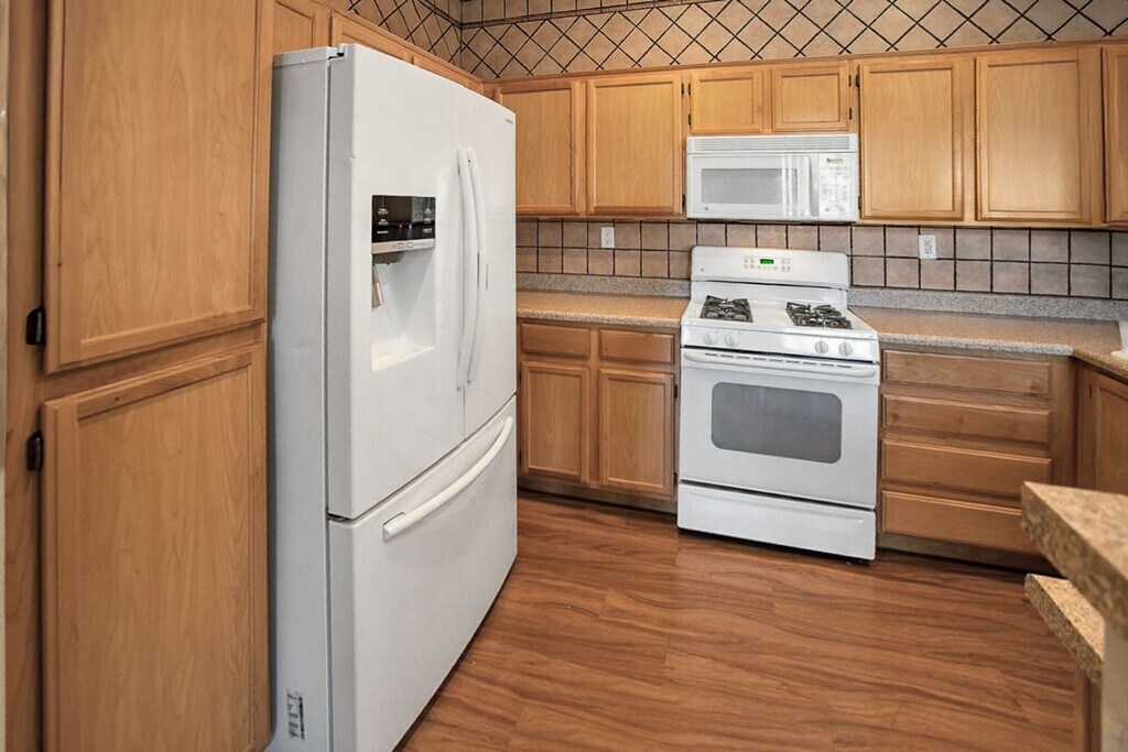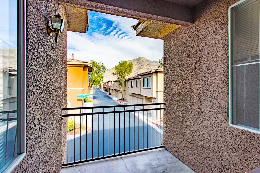 Beautiful, well kept, 2 bedroom, den and 1 car garage condo in a fantastic Northwest gated community; Tile entry, carpet stairs and man made laminate wood flooring throughout the living area; Dining area with light; Living room with fireplace; Kitchen with breakfast bar, full counter to ceiling tile backsplash, includes refrigerator and microwave; Hall with linen closet and built in storage cabinets; Den with ceiling fan, light, cable and closet; Laundry room with washer, dryer and shelve; Guest bedroom with ceiling light and cable; Full guest bathroom; Primary suite with ceiling light, cable, walk in closet with built-ins, double sink and tub/shower combo; Balcony with great mountain views; 1 car attached garage with auto doors and entry into the home; Community center, pool, spa and exercise facility; Convenient to the large Majestic Community Park, the 215, shopping and dining! (Total Rent Includes: Rent $1595 + RBP $45 + Sewer $25)
