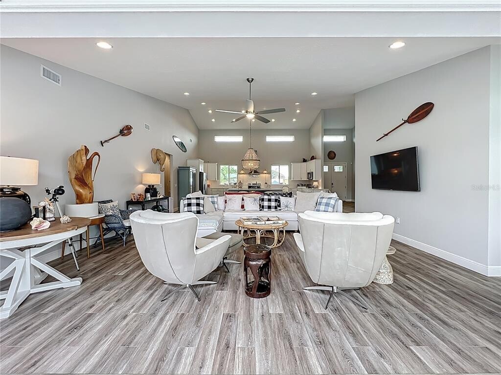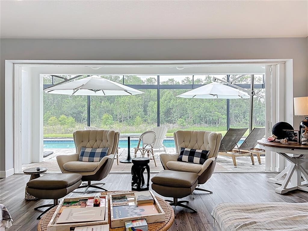 Beautifully designed and fully furnished 5 bedroom and 3.5 bath home in the heart of Groveland is everything you need to experience country living at its finest. The home sits on 30 acres of parklike grounds which offers many recreational activities for you to enjoy such as a putting green,a target range,a fruit orchard,and a common pavilion where you can enjoy an outdoor bbq or sit and watch the beautiful sunset with a refreshing drink. Relax on the outdoor lounge chairs next to the fire pit on cooler evenings and enjoy the surrounding nature as you may spot some cranes or deer walking around. Inside the home,you will find beautiful high end furnishings and four poster beds designed for ultimate comfort. This home also includes a solar powered heated lap pool which is always ready to use. You will also find furnishings on the pool lanai which includes an area for dining and lounge chairs perfect for taking in the tranquil forest stretching through the entire property. Rent includes electricity,water,lawn,and internet. Maid service every two weeks is also included with the rent. Salt treatment tanks for house water. MLS# O6367286
