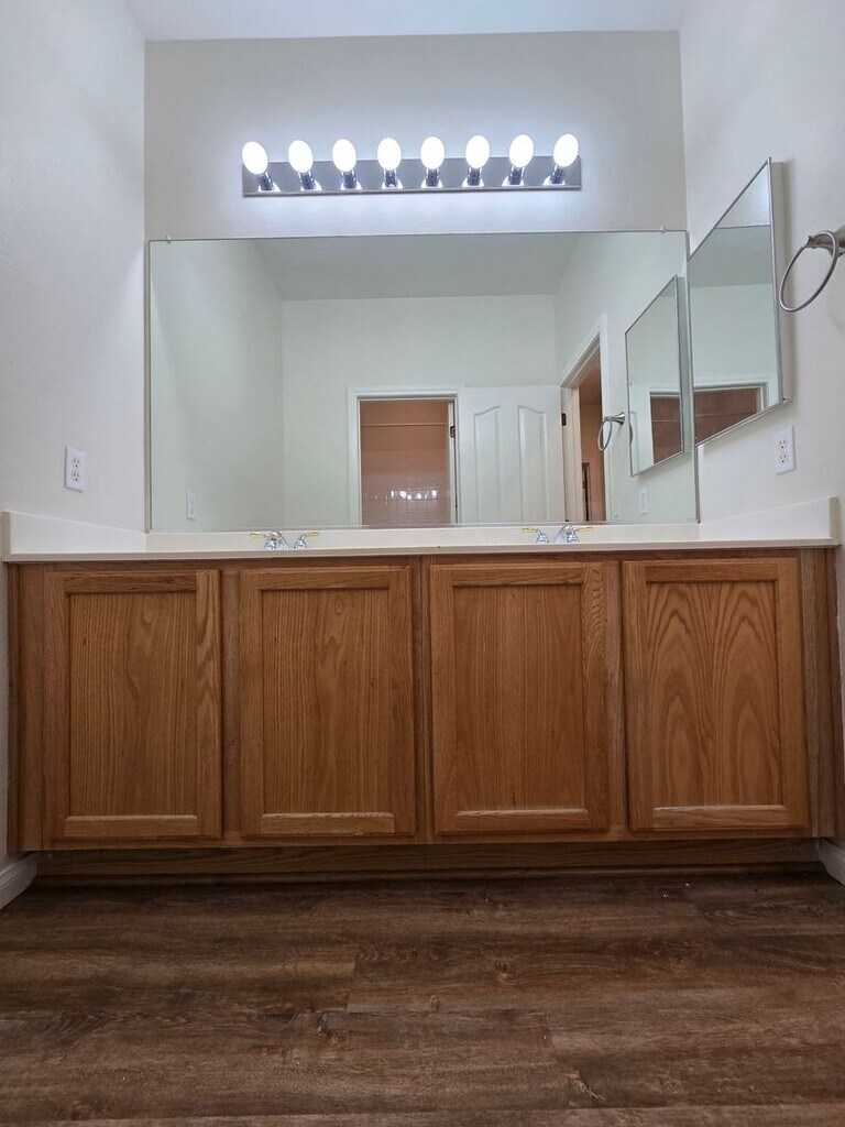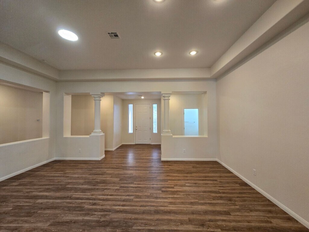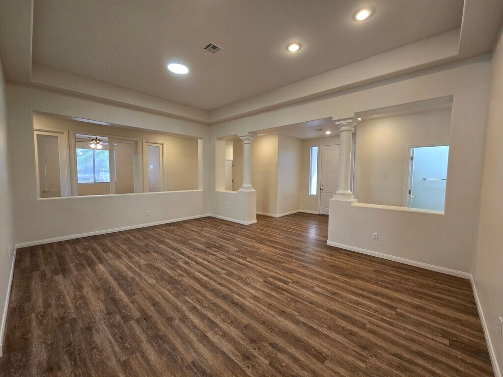 A Fabulous single-story home located in desirable NW Las Vegas! Upon entry, you are welcomed by a spacious open floor plan featuring a formal living room with neutral paint and laminate wood flooring throughout the main living areas. The inviting family room offers a cozy fireplace and ceiling fan, perfect for relaxing or entertaining. Just off the family room, the kitchen boasts granite countertops, a breakfast bar, double ovens, and ample cabinet space. Down the hallway, you will find the primary suite behind double doors, complete with plush carpeting and a walk-in closet. The primary bathroom features dual sinks, a separate Roman Jacuzzi tub, and a separate shower. All bedrooms include ceiling fans for added comfort. Step outside to a beautifully maintained backyard with mature landscaping and a covered patio—ideal for enjoying the outdoors. THIS IS A MUST-SEE!!! Please note that the rent includes a $100 fee per month for the Sewer, Trash, and the Resident Benefit Packet. Please call with any questions.