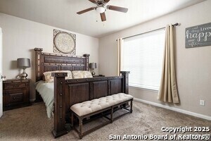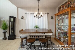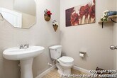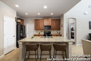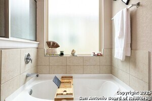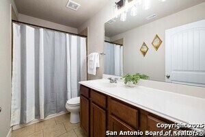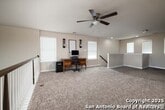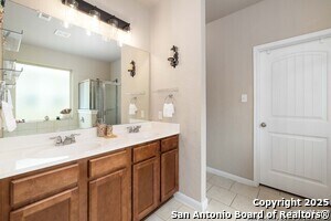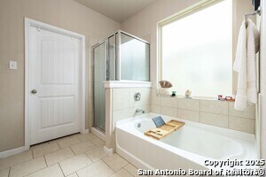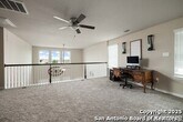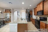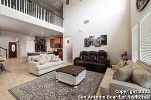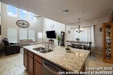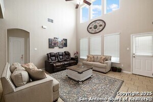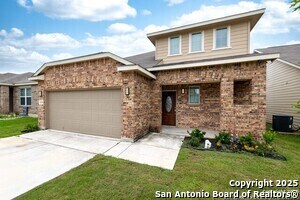 Tucked into an established neighborhood in close proximity to Randolph AFB, this beautifully appointed home offers a spacious layout designed for both comfort and function. High ceilings and an open-concept design create a bright, airy feel throughout the main living areas. The kitchen features sleek granite countertops, 42 upper cabinets, and a coordinating tile backsplash, flowing into the dining and family room for a seamless layout. The primary suite is located on the first floor and includes a full bath with a soaking tub and separate shower. Upstairs, two generously sized secondary bedrooms share access to a large media room that can serve as a game room, second living area, or home theater. Outside, you'll find a covered patio and a spacious backyard. Additional upgrades include all-new lighting throughout the home and a finished garage with polyurea flooring, insulation, and air conditioning. Conveniently located near Randolph Air Force Base, with easy access to Loop 1604, I10, FM 78, and a variety of shopping, dining, and schools in the Converse area, this home offers a balanced combination of comfort and accessibility."