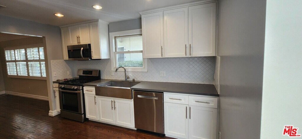 Experience the perfect blend of 1920s Mediterranean charm and sophisticated modern living in the heart of the Miracle Mile. This expansive, approx. 2,000 sq. ft. residence features 3 bedrooms plus a versatile family room, all meticulously renovated with high-end finishes. The main level welcomes you with a huge living room bathed in natural light, leading to a gourmet kitchen with quartz countertops and a charming breakfast nook. Sun-drenched interiors boast hardwood floors throughout, recessed lighting, and elegant plantation shutters. Enjoy your morning coffee on the private front balcony or retreat to the peaceful rear deck off the primary suite. Modern essentials include Central AC/Heat, a dedicated in-unit laundry room, and two-car parking. Ideally located just blocks from the best dining, museums, and culture L.A. has to offer. MLS# 26649099