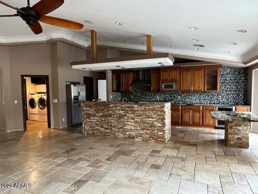 Discover island-community living at its best in this beautifully upgraded,single-level split floor plan home featuring four bedrooms and two bathrooms. Designed for both comfort and entertaining,this residence offers an inviting flow with travertine flooring and abundant natural light throughout. The gourmet kitchen is a standout centerpiece,featuring stainless steel appliances,granite countertops,and a water softener with RO systemperfect for cooking,hosting,and everyday convenience. Step outside to your private backyard,complete with a spacious tile patio,landscaping,fruit trees,and a path that leads to a refreshing diving pool. Whether you're hosting gatherings or seeking a peaceful retreat,this outdoor space delivers. Located in the highly desirable Gilbert Island comm