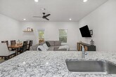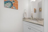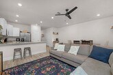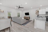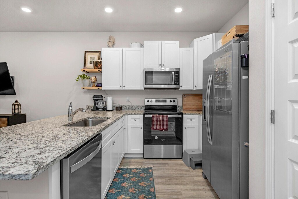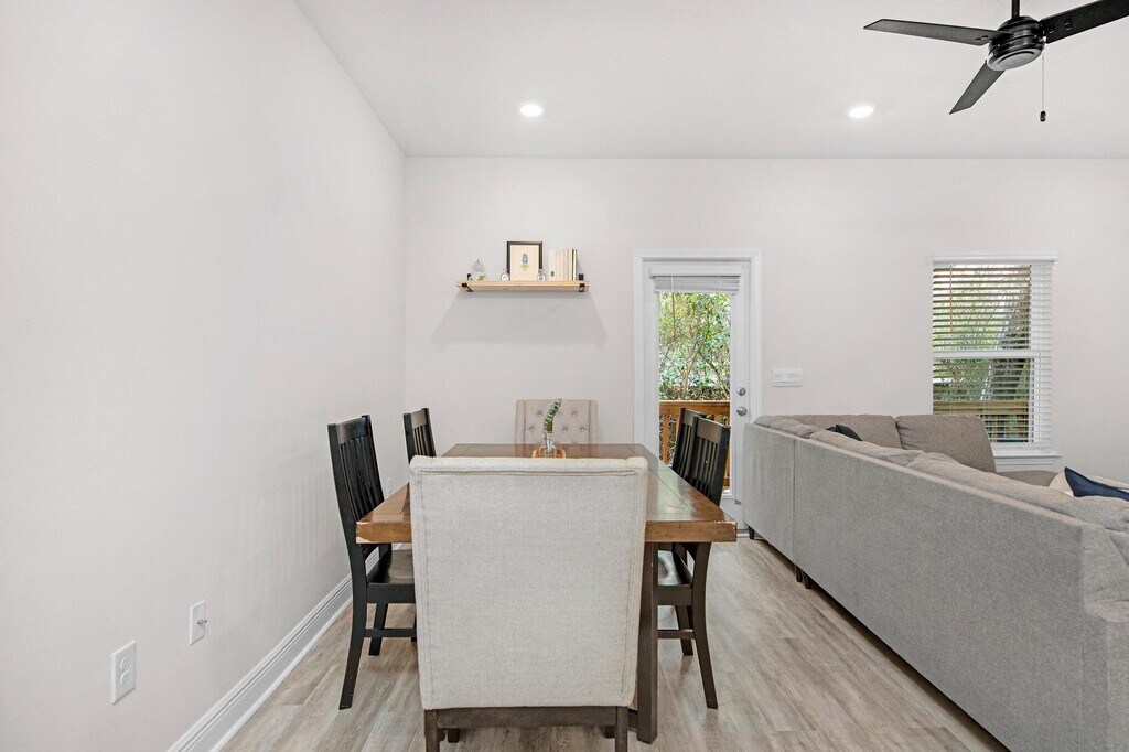 Step into this nearly new coastal-style townhome in the heart of Fort Walton Beach, where convenience meets modern beachside living. Designed with a light, airy aesthetic, this home features crisp white cabinetry, stone countertops, and a fully appointed kitchen with sleek stainless steel appliances. The open-concept living area showcases luxury vinyl plank flooring in a light wood look, complemented by recessed lighting and abundant natural light throughout. Perfect for entertaining, the main level includes a guest half bath and easy access to the back porch, overlooking mature trees for privacy and shade. Upstairs, the primary suite offers plush carpet, a large window, and an en-suite bath with a dual vanity, matching cabinetry and stone countertops, and a glass-enclosed walk-in shower.