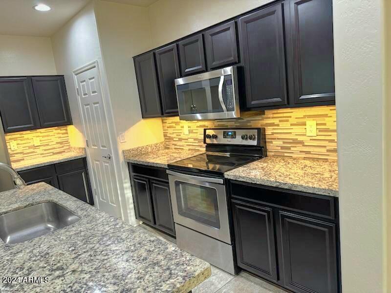This stunning home features a spacious open layout with modern finishes throughout. The kitchen boasts dark cabinetry,granite countertops,and stainless steel appliances,with a refrigerator included. Enjoy tile flooring in all the right places and plush carpet in the bedrooms for comfort. The backyard offers plenty of space for outdoor living and entertaining. Conveniently located near shopping,Loop 303,I-10,and just minutes from downtown Phoenix.