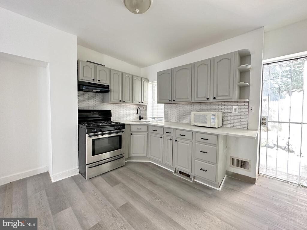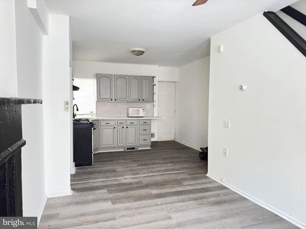 This charming rowhome in the Graduate Hospital neighborhood of Philadelphia boasts two cozy bedrooms and one full bathroom. As soon as you step inside, you'll be greeted by an open-concept layout and stylish grey laminate flooring. The kitchen is a wonderful space, with beautiful shaker cabinets painted in a soft grey hue, chic black knobs, white marble quartz countertops, and white subway tile backsplash. Just off the kitchen, you'll find a large outdoor space that's perfect for hosting guests or enjoying a quiet evening under the stars. Living at 1026 S Cleveland St. puts you just a short stroll away from some of the city's most popular eateries, including On Point Bistro, Luhv Vegan Bistro, and Cafe Ynez. You'll also be within walking distance of Chew Park and the thrilling Bury The Hatchet Axe Throwing Philadelphia. Plus, convenient access to bus routes 17 and 64 makes getting around town a breeze. Don't miss your chance to see this lovely home in person - schedule a showing today! Disclaimer: Some photos in this listing include virtual staging for illustrative purposes only. The furniture and decor shown are computer-generated and do not reflect the actual contents of the property. No furniture, accessories, or other personal property depicted in the images are included.