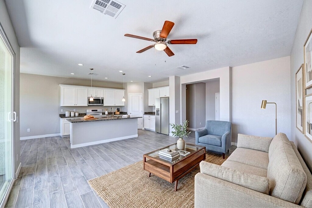 Step into this beautifully built 2023 home with 4-beds,2-baths,where modern design meets everyday comfort. This thoughtfully designed single-story residence offers a spacious and open layout,highlighted by sleek tile flooring throughout the main living areas and plush carpeting in the bedrooms,creating the perfect balance of style and coziness. The kitchen is the heart of the home,designed to impress with stainless steel appliances,granite countertops,abundant cabinetry,a walk-in pantry,and a large island thats ideal for meal prep. Just off the kitchen,the dedicated dining area provides the perfect space for hosting dinners or enjoying quiet meals at home. The living room flows seamlessly to the backyard through sliding glass doors,opening to a private outdoor space complete with a covered patio and an RV gateperfect for entertaining or simply unwinding. The primary suite offers a peaceful retreat,featuring a walk-in closet,a private bathroom with dual sinks and a beautifully tiled walk-in shower. The additional bedrooms are generously sized,offering flexibility for guests,a home office,or hobbies. A dedicated laundry room with washer and dryer hookups adds convenience,while the 2-car garage provides ample storage and parking. Located in a growing community,this home offers easy access to local parks,schools,and dining options,with nearby golf courses and open desert landscapes perfect for outdoor enthusiasts. With quick connections to major roadways,commuting to surrounding cities like Casa Grande or even the Phoenix metro area is simple and convenient,making this home an exceptional blend of comfort,style,and accessibility. We welcome all furry friends of any size! *Please note: this home is unfurnished.* *Photos may include virtual staging to illustrate potential room use.*