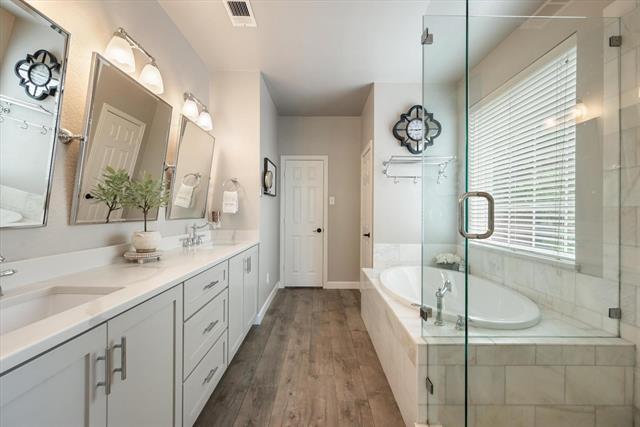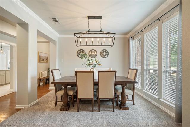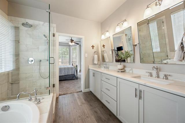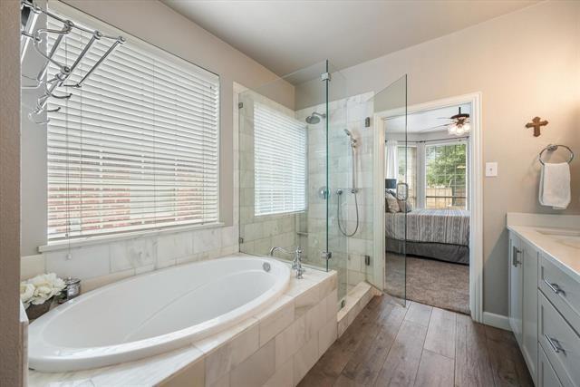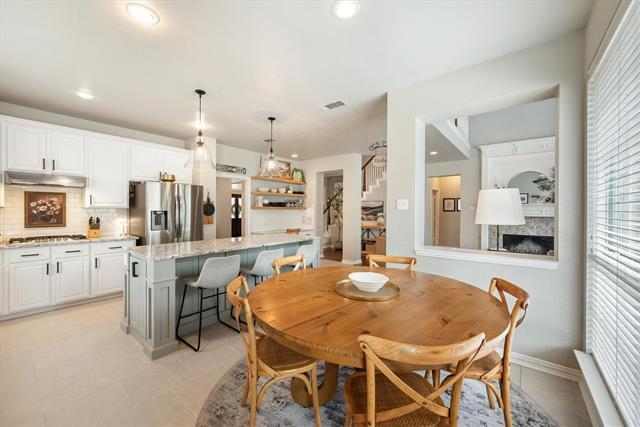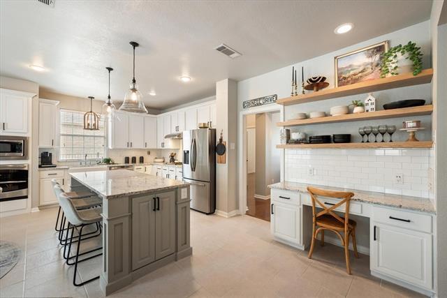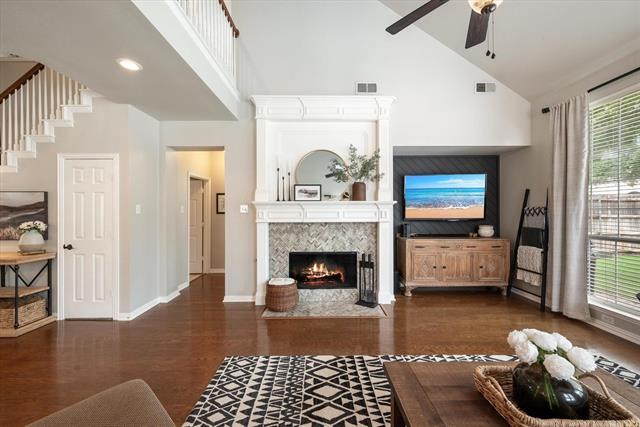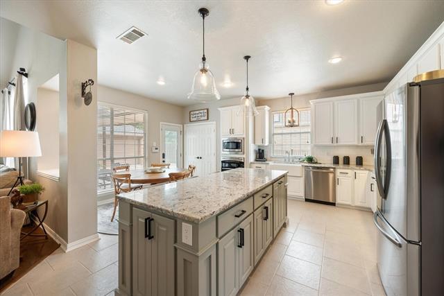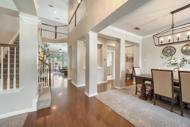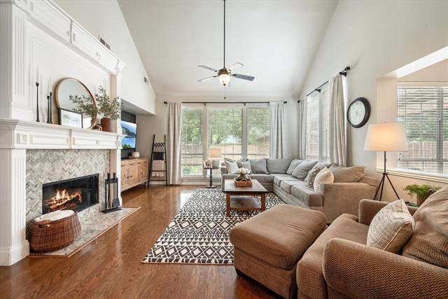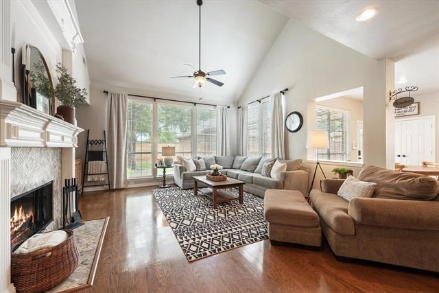Come see this beautifully updated home nestled in the coveted Bloomfield Addition at Hidden Lakes. The floor plan offers 4 bedrooms, 3 full and 1 half bathrooms, 3 living areas & a designated office, or optional 5th bedroom. The open floor plan features vaulted ceilings, wood floors & fabulous decorative accent walls throughout. The primary suite is showcased by tall ceilings, a picturesque bay window & an ensuite bathroom with custom cabinetry, quartz countertops & a stunning marble tiled walk in shower with a relaxing soaker tub. The chef's kitchen features a large center island, SS appliances, a farm sink, upscale lighting, & granite countertops, all complimented by classic white cabinetry & white subway tiled backsplash. Outside you will find a spacious extended patio & yard connected to a heated & cooled garage creating a comfortable & versatile space to relax. Ideal location, in proximity to many dining and shopping options, all within the award winning Keller ISD.
