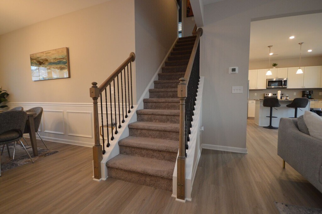 Like new single family home sits on a quiet cul de sac and features a 2 car garage, spacious yard, and a rear patio perfect for outdoor enjoyment. The main level offers LVP flooring throughout, along with a modern kitchen that includes granite countertops, a kitchen island with space for bar stools, and a pantry closet, all flowing into separate dining and living areas. Upstairs, all bedrooms are conveniently located along with a dedicated laundry room, and the home comes equipped with a washer and dryer. Additional perks include EV ready electrical plumbing in the garage, making this home both comfortable and future forward.