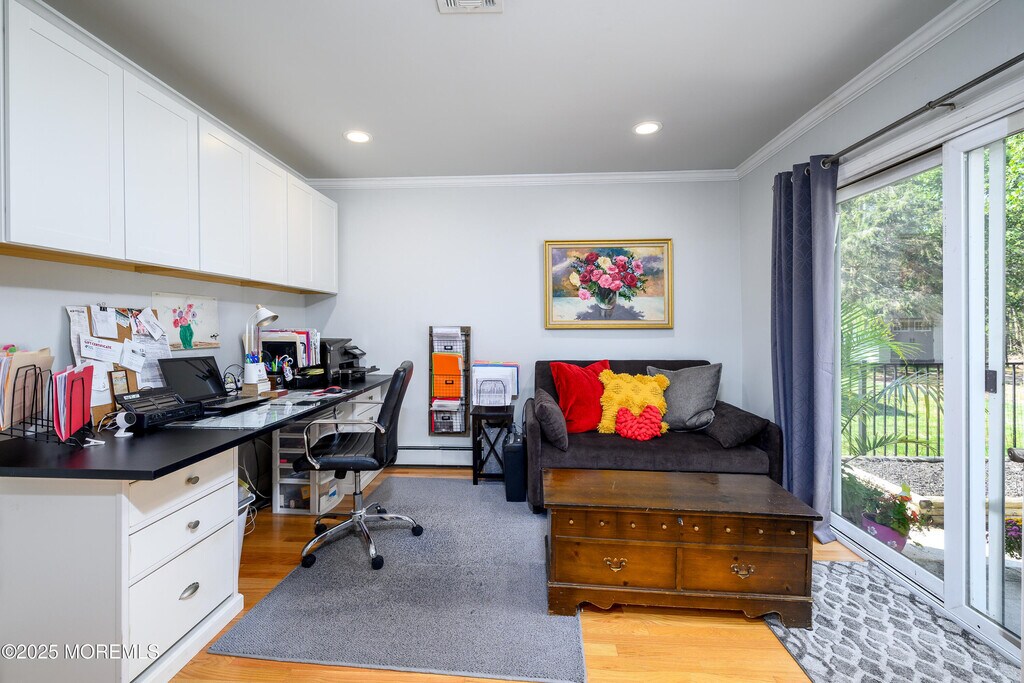 Stunning home with a touch of elegance and special upgrades. Hardwood floors carry t/o the main living areas as do recessed lighting and crown mouldings. The kitchen has beautiful,soft close cabinetry and gleaming quartz counters,a slide in stove & reverse osmosis water filter - open to the living & dining rooms for easy conversing. The floor to ceiling stone fireplace adds character,warmth and ambiance. Off the living area are French doors leading to a private room perfect for den,office,hobby or guest room. Custom closets for organization. Bathrooms tastefully upgraded. Separate laundry. Garage + a double wide driveway. Large rear patio area for dining outdoors and a place to relax and appreciate the tranquil,scenic woods that change with the seasons. Patio is fenced.