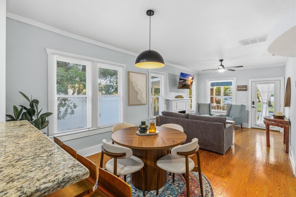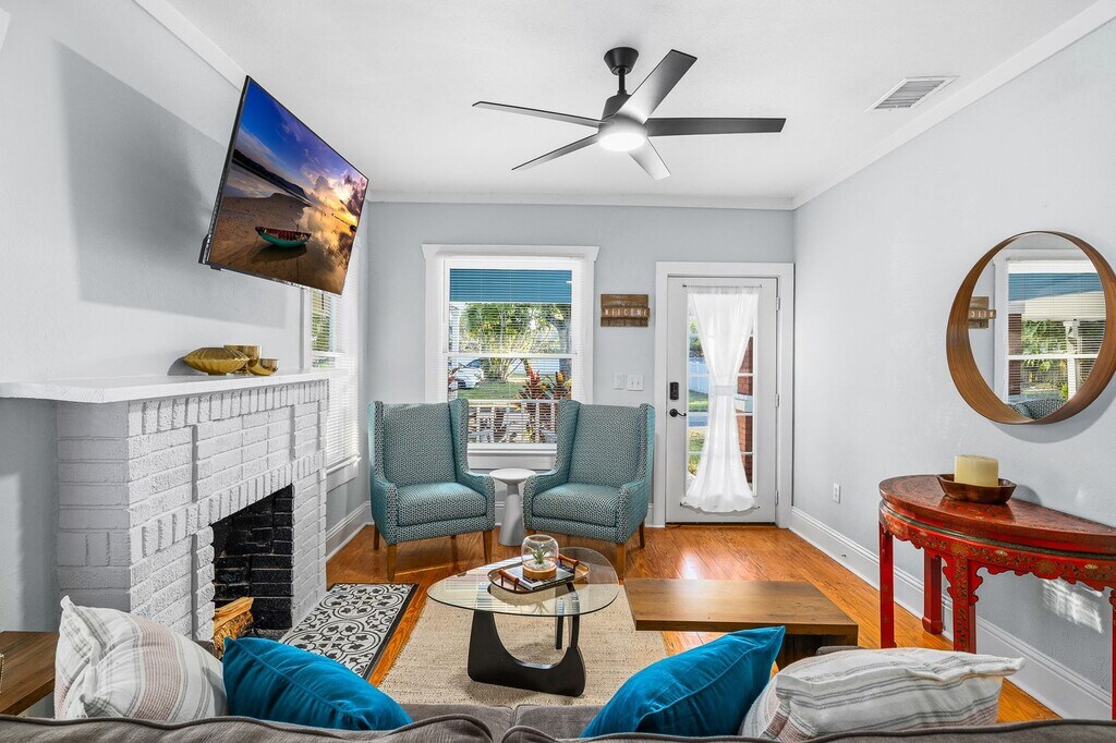 Professionally designed interior with warm wood floors and lots of natural light Flexible layout: 2 bedrooms plus option to add a queen and extra bed in the sunroom on request Working fireplace and cozy living room for relaxing after a long day Fully fenced backyard, great for pets, with lit patio, Adirondack chairs, and new BBQ Kitchen with double sinks, window over the sink, pantry, and bar seating Private driveway parking and small storage shed for extra belongings Quiet Seminole Heights street, close to trendy restaurants, cafes, and breweries