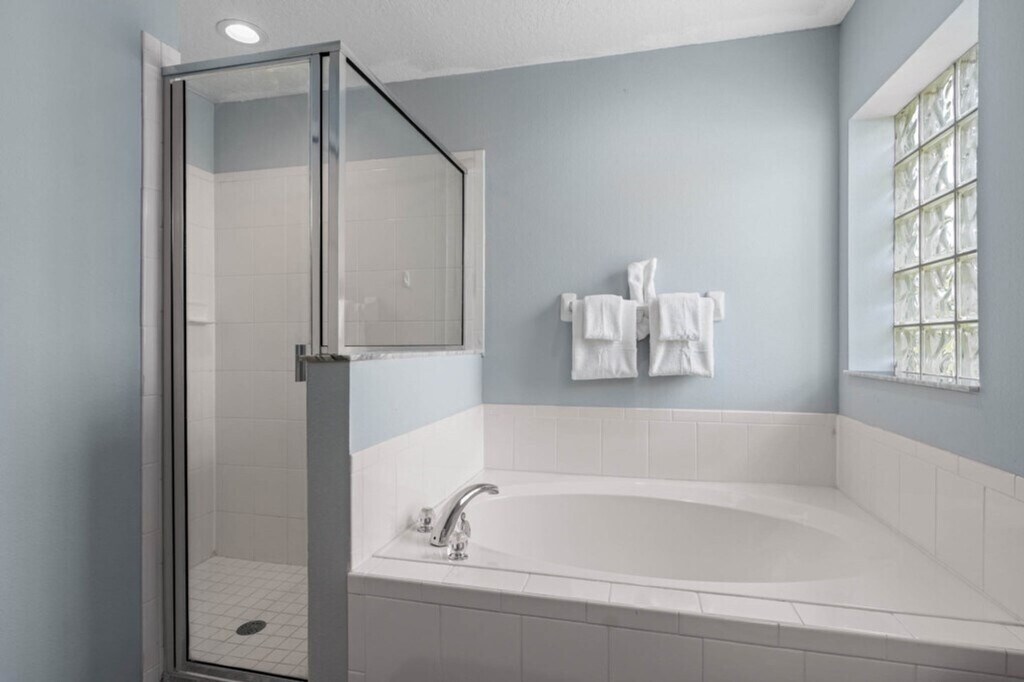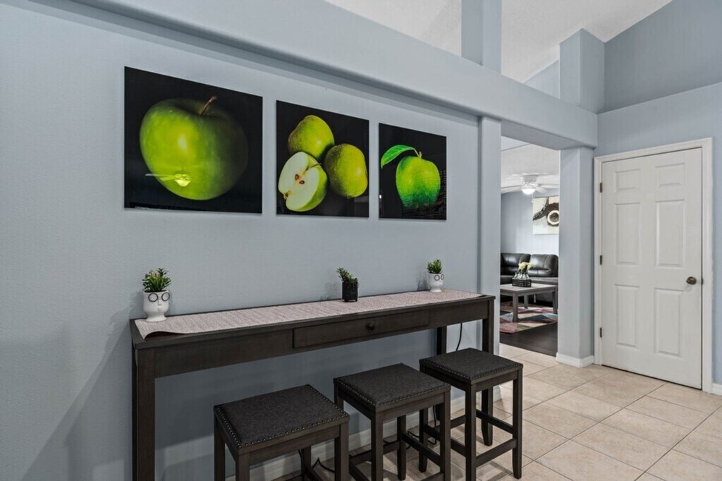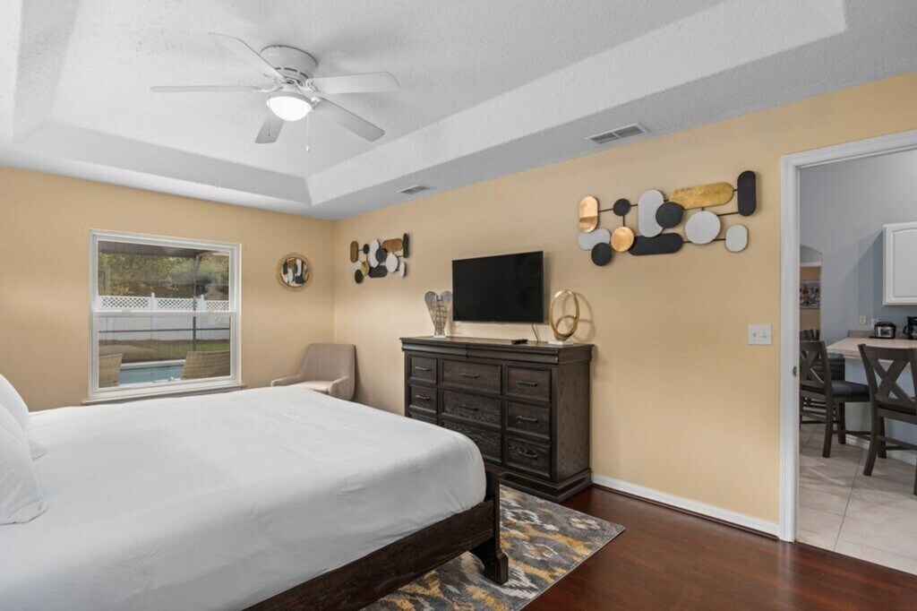 Welcome to this stunning 5-bedroom, 3-bathroom villa in the highly desirable Legacy Park, Davenport. Perfect for up to 10 guests, this spacious 2,589 sq. ft. home features a private pool, spa, and stylish interiors, just 7.3 miles from Disney. Feel at home with a fully equipped kitchen, comfortable bedrooms, and a game room for endless fun. With close proximity to Orlando attractions and peaceful conservation views, this home is your ideal Florida getaway. Relax in the open living area with plush leather sofas, a wide-screen TV, and a surround-sound entertainment system. Enjoy meals together in the elegant dining area with seating for six, or at the casual kitchen island. The villa offers five beautifully decorated bedrooms. Two master suites feature king-size beds and en-suite bathrooms for added privacy. Two queen bedrooms and a vibrant twin bedroom provide comfortable sleeping arrangements for everyone. The fully equipped kitchen has everything you need, including modern appliances, a coffee maker, and ample counter space for preparing family meals. Step outside to your private screened-in pool and spa, complete with LED night lighting. Relax on the patio’s lounge chairs or enjoy alfresco dining under the covered lanai. Stay entertained with a game room, TVs in every bedroom, free Wi-Fi, and a DVD library. For little ones, a high chair and pack-n-play are included. Laundry facilities and a starter pack of essentials are also provided. Pool and spa heat is available for $35 per day with a minimum of 3 days, and must be requested 7 days prior to check-in. A cleaning fee applies to all stays, with mid-stay cleaning available for an additional fee. Legacy Park is just 15 minutes from Walt Disney World and a short drive to other Orlando attractions. Enjoy the tranquility of the conservation area nearby, or explore the vibrant local dining and shopping options. There is limited parking at the property address. Two vehicles are allowed to be parked in the driveway provided they do not block sidewalks, park on the streets, or on the grass. The parking of RVs is prohibited in the community. Vehicles can be towed at the owner’s expense if rules are not followed. If the issue escalates, guests can be trespassed by the Polk County Sheriff’s Office and the property manager/owner will be notified. The villa accommodates up to 10 guests. No parties and no pets are allowed. No outside guests (visitors) without contacting management. The driveway accommodates 2 cars with extremely limited street parking. Help us keep this home in excellent condition by leaving it as you found it. If there is anything in the home that needs attention, kindly let us know. A guest screening process will be conducted, and further instructions will be provided to complete this step.