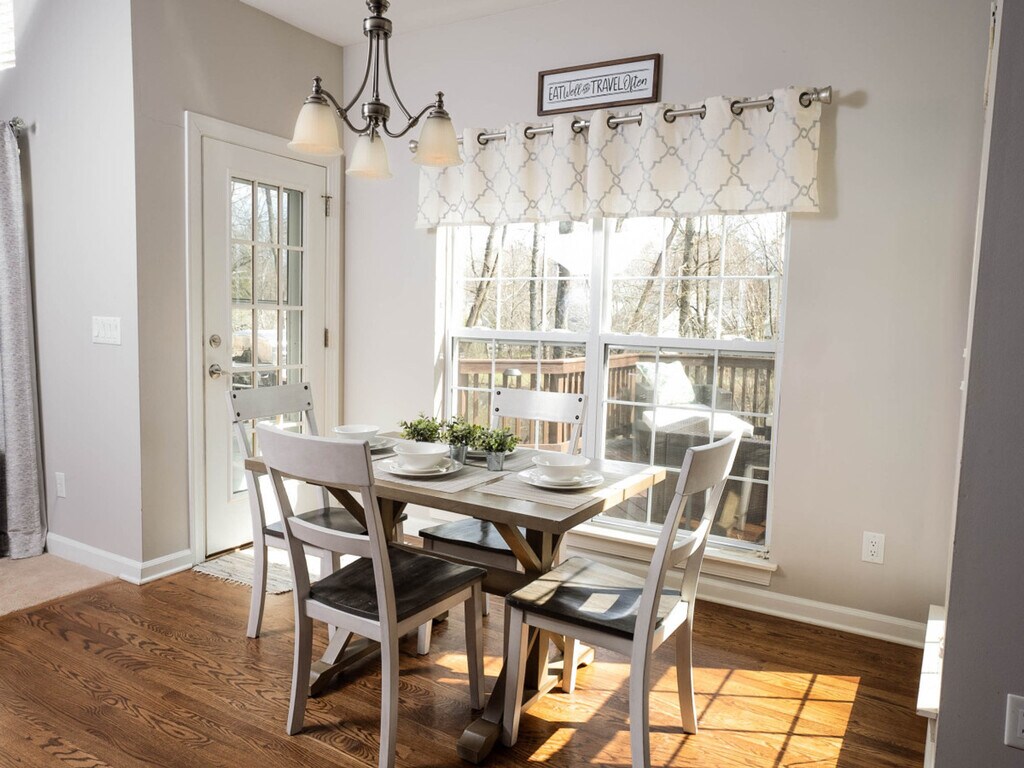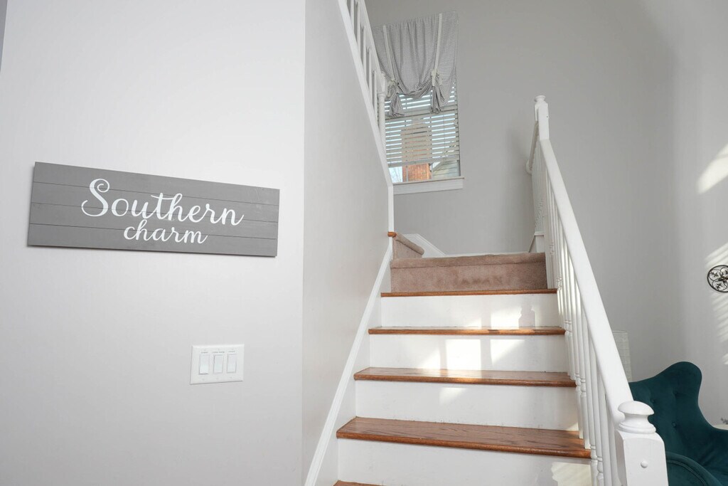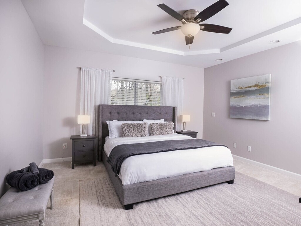 Experience the charm of Charlotte in this inviting home, perfect for couples, business travelers, and families. Enjoy your morning coffee on the back deck, surrounded by a private, wooded backyard. Located just 15 minutes from Carowinds Amusement and Waterpark, this property offers a tranquil retreat after a day of exploring the city. With five spacious bedrooms, including two king-size and three queen-size beds, and 2.5 bathrooms, this home comfortably accommodates up to 12 guests. The open-concept living room features a flat-screen Smart TV, and the large kitchen is equipped with stainless steel appliances. The fully equipped kitchen boasts stainless steel appliances, cooking basics, and a Keurig and drip coffee maker. The dining area offers seating for up to 13 guests, making it ideal for gatherings. Relax in the living room on the sectional sofa while enjoying your favorite shows on the big screen Smart TV. The home also includes an in-unit washer and dryer, central heating and air conditioning, and complimentary toiletries. Free parking is available with space for two vehicles in the garage and two in the driveway, along with overnight street parking. If you're traveling with a pet, an additional fee of $300 per pet per stay applies. This property is ideally located near many of Charlotte's attractions, restaurants, shopping centers, and the expressway. The neighborhood is safe and family-friendly, making it a popular choice for travelers. This property enforces a strict no-smoking or vaping policy inside the house or garage, with a $500 fine for violations. Smoking is permitted outside in the backyard only. Quiet hours are from 9 PM to 8 AM to ensure a peaceful environment for all guests. The property is equipped with Ring cameras for security, monitoring the front, backyard, and driveway. Corporate and social events are allowed only with pre-approval, and additional fees may apply. No more than 12 guests are allowed unless pre-approved, and no unregistered guests are permitted. The fireplace is not available for use, and parking or driving on the lawn is prohibited to prevent damage. The office space includes a desk and office chair, providing a comfortable environment for remote work. A queen-size air mattress is also available in the office for additional sleeping arrangements. For extended stays longer than 10 nights, full housekeeping service is required once per week. Guests can choose to perform this cleaning themselves or hire a professional cleaning team for an additional fee. Failure to comply may result in additional charges. [SI]