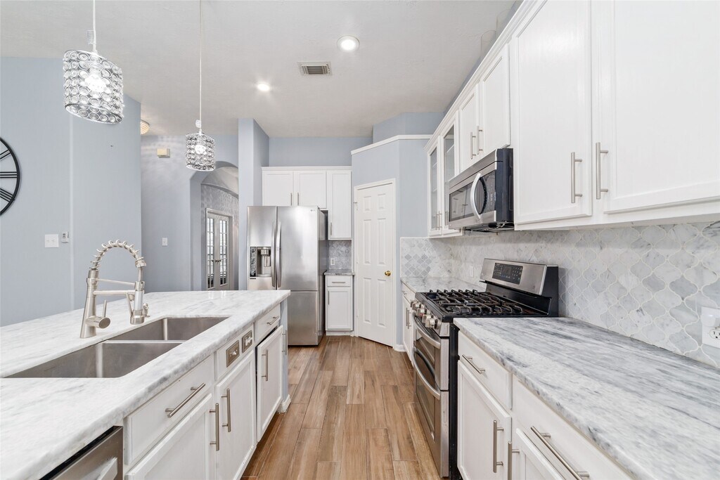 Here’s suburban living that's second-to-none in a scenic,quiet spot in master-planned Sienna Plantation! This gorgeous corner lot home boasts a modern interior,beautiful home office with French doors and a flow-through living area with a stacked stone fireplace and wood floors throughout. Cooking and cleaning have never been easier thanks to this spacious kitchen that has been well-maintained with stainless-steel appliances,double oven,quartz countertops,stunning kitchen island,spotlights,and built-in wine fridge. Adding to the home’s attractiveness,the primary bathroom offers a spa-like ambiance and features a separate shower,freestanding tub,double sinks and beautiful tile flooring. In the backyard,you will enjoy a covered patio and POOL! The perfect location for outdoor fun. Avoid mud and nasty weather with a large 3-car attached garage. A rare opportunity. Schedule your showing today! MLS# 65414263