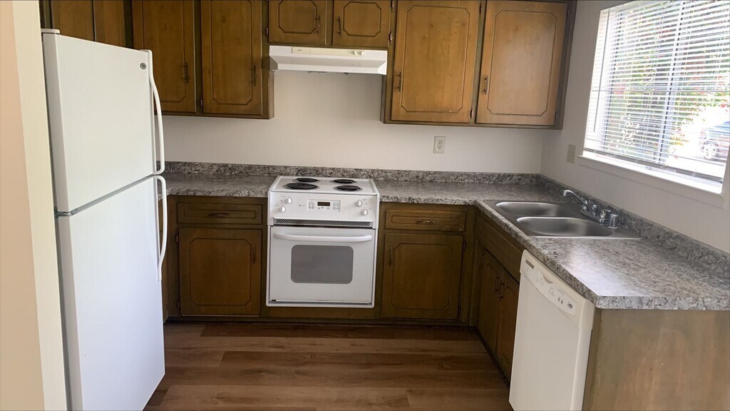 2 Bedrooms, 1.5 bathrooms. Living room, dining area and kitchen have hard surface flooring. Half bath downstairs. Upstairs is carpeted and has the two bedrooms and full bath. Central heating and air conditioning. Ceiling fans in bedrooms. Assigned parking. Water and trash paid. Coin operated laundry room onsite. NO PETS. NO SMOKING. Shown by appointment.