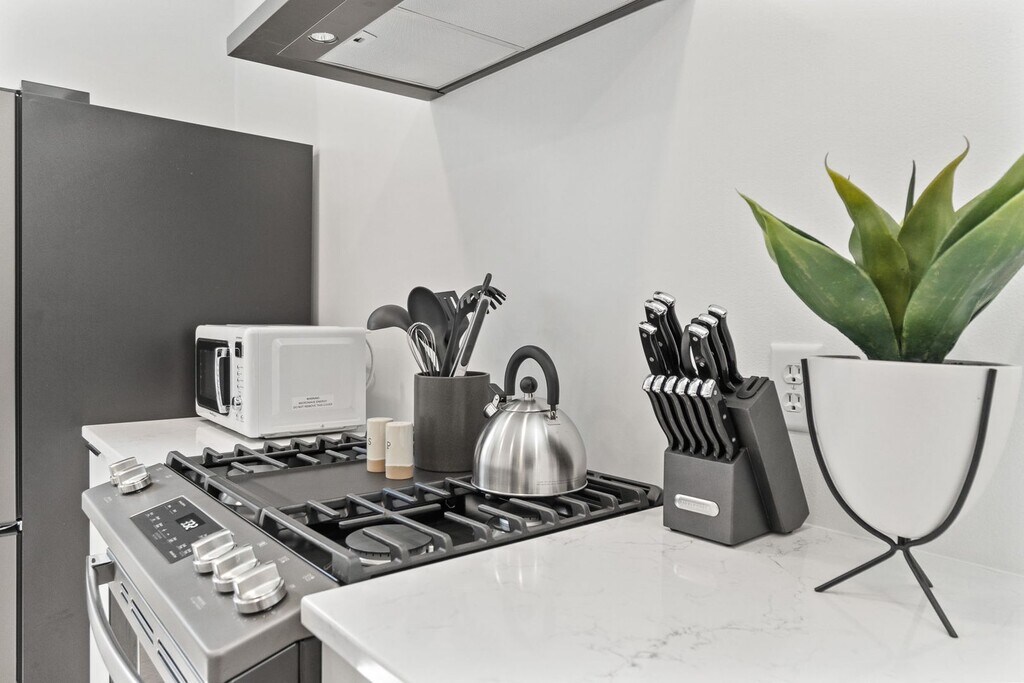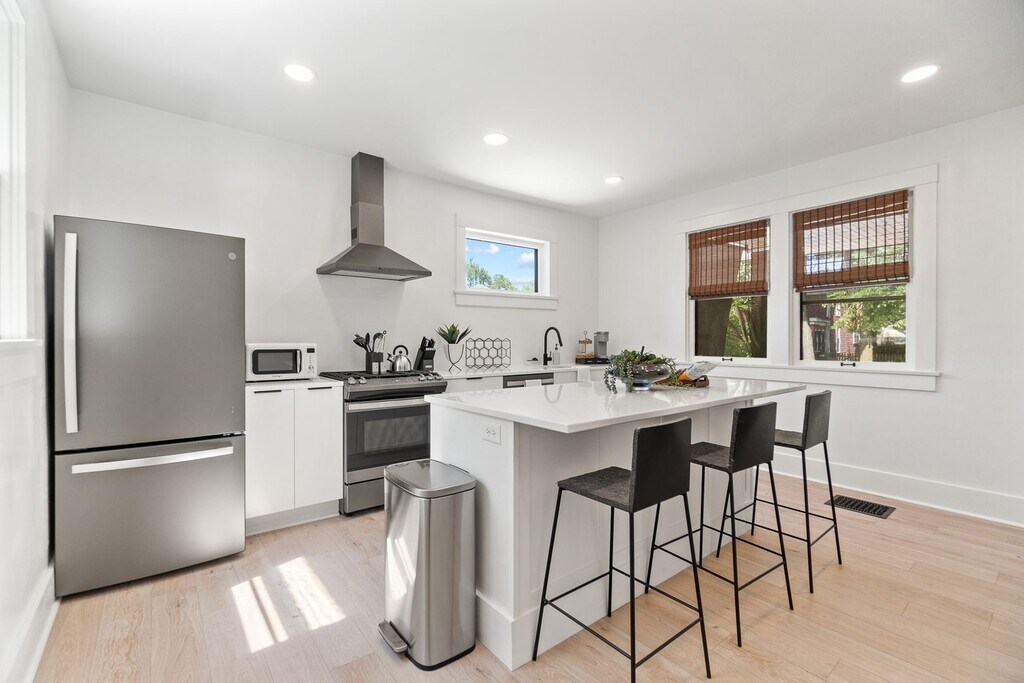Beautifully renovated historic 2 bedroom, 1 bath townhome in West Central — Fort Wayne's most walkable historic neighborhood, just minutes from downtown. At ~1,000 sq ft, this home blends preserved original woodwork with a fully modern interior renovation. UNIT FEATURES - Original dark-stained staircase, baseboards, and front door preserved through renovation - Open-concept kitchen with quartzite island and bar seating - Stainless gas range with chimney hood, stainless dishwasher, counter-depth refrigerator - Modern white cabinets with matte black hardware - Wide-plank LVP flooring throughout - Modern globe chandelier in the living room - Walk-in shower with marble-look tile surround and black slat-front vanity - Recessed LED lighting and bamboo woven shades - Washer and dryer in unit - Black-framed historic double-hung windows EXTERIOR & PARKING - Covered front porch - Private driveway with one off-street parking spot - Tesla EV charger included LOCATION - West Central neighborhood — historic, tree-lined, walkable - Walking distance to downtown Fort Wayne, Promenade Park, Electric Works, restaurants, and bars PET POLICY - Cats and dogs welcome (large and small) Unit 1032 College