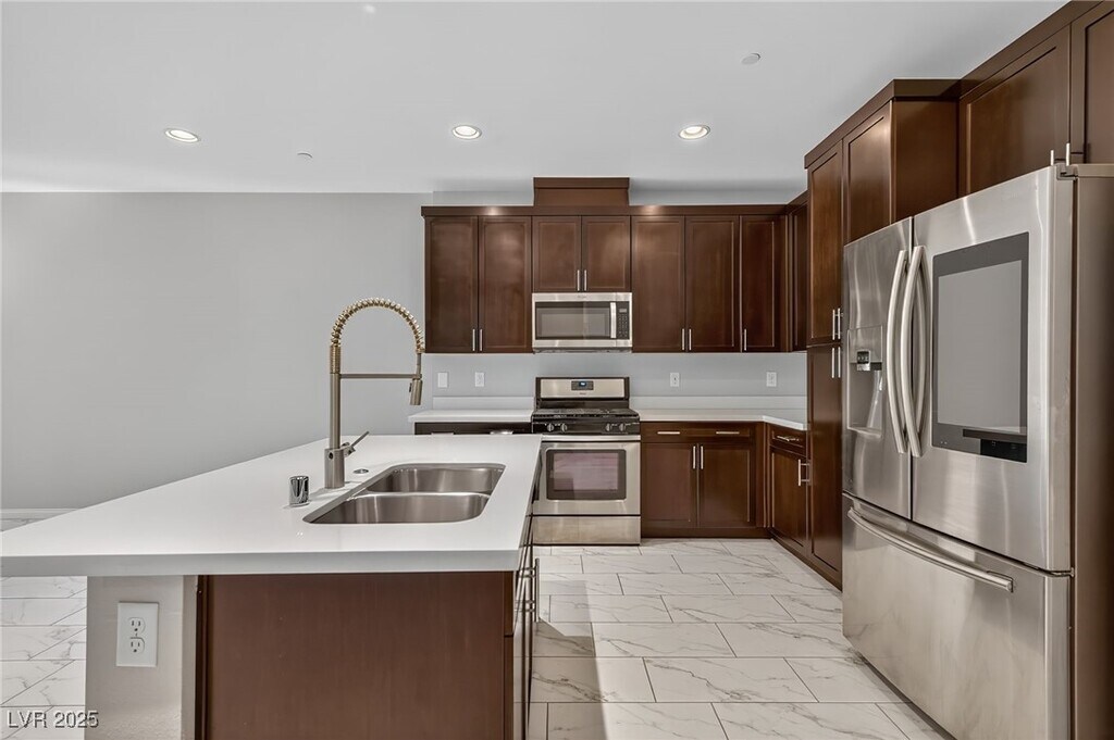 FANTASTIC 2-BEDROOM TOWNHOME IN GUARD GATED TUSCANY VILLAGE! Located in the prestigious Tuscany Village guard-gated community in Henderson this gorgeous townhome features 2 bedrooms, 2.5 bathrooms and a 2-car attached garage. Step inside to find spacious open-concept living areas with tile and luxury vinyl plank (LVP) flooring— offering the durability and easy care we all love. Modern kitchen featuring quartz counters, center island, pantry, and stainless appliances Dual primary suites upstairs, each with en-suite bathrooms and walk-in closets. Ideal for privacy Laundry room with upper cabinetry and full-size hookups (gas dryer) Tuscany Village community is a guard gated community that offers a Recreation Center with pools, spas, fitness center, tennis, volleyball and basketball courts, and much more! Come and see this beautiful townhome and make it your own!
