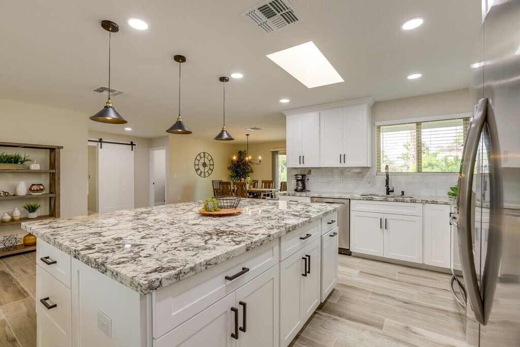 Completely renovated and furnished home in the desirable golf community of Sun City. The open floor plan features a formal dining room and great room off the kitchen with an island. The home was remodeled in 2022 with upgraded finishes such as plank tile flooring t/o,custom Shaker cabinets,Granite countertops,stainless steel appliances including fridge and wine fridge,kitchen tile back splash,pendent lights. New light and plumbing fixtures,new interior and exterior paint,garage epoxy flooring,new HVAC,new gas water heater,dual pane windows,new garage door. Large covered patio with propane grill,private backyard with block fencing. Owner has solar partnership with Electric Company (APS). Tenant will receive a monthly $30 credit. Access to the Recreation Centers of Sun City is available for an annual fee.