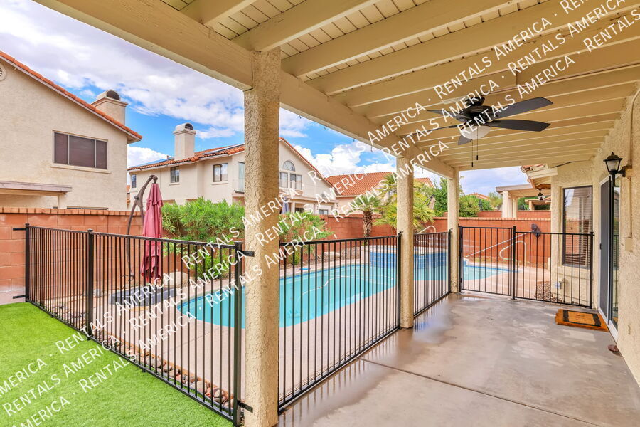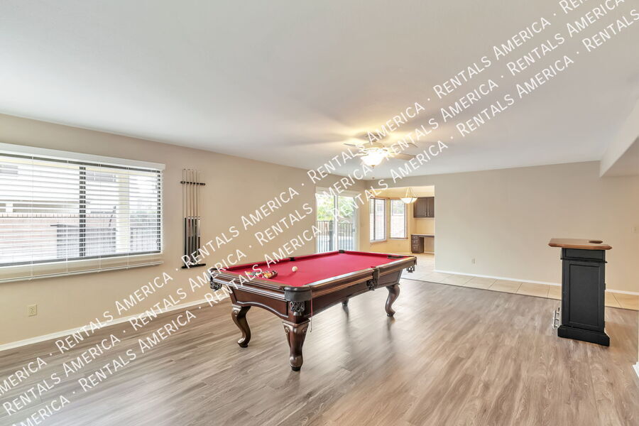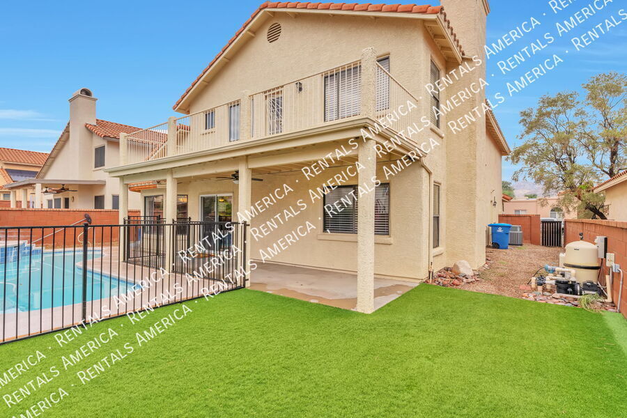 This beautiful home is located in the desirable, gated community of The Villages of La Canada. Through the front door you enter a spacious, open floor plan with vaulted ceilings and beautiful 18 inch tile flooring. The upstairs carpet is fairly new. This home has plenty of space with 4 bedrooms and 2.5 bathrooms. There is a den downstairs that is perfect for a guest room, office, playroom or library. The master suite has a private balcony to enjoy and has tons of closet space. The master bath is complete w/double vanity sinks, a large garden tub and separate shower. The kitchen has ample cabinet and counter space, stainless steel appliances and a brand-new second refrigerator in the garage for your use! Enjoy the large great room with fireplace, pool table and bar. The sliding glass door leads to the beautiful backyard which is perfect for year-round use with a pool, spa, and turf area. This home is waiting for you. One-Time Admin Fee: $300. Monthly Service Fee: 1% of monthly rent. Refundable Pet Deposit: $300/Pet, if applicable. Resident Benefits Package: $39/month. Helping Heroes Discount Available! Cats Allowed Dogs Allowed Dryer Garage Pets Allowed Pool Washer