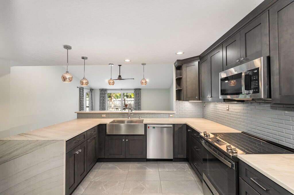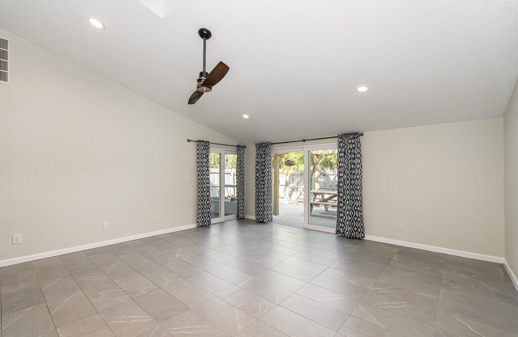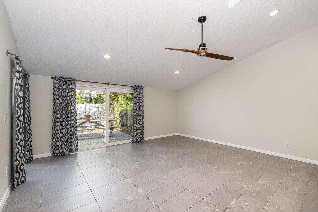 A short walk to the beach & the river,this updated townhome is chic,sleek & ready for move-in! 3 outdoor living spots encourage indoor/outdoor fun. Angled ceilings arch over gray marbled tile floors & ultra-modern appointments. The large great rm exhibits 2 sets of sliders to the outdoor oasis. Pendant lighting accents a luxury b-fast bar kitchen featuring granite waterfall edging,slate-colored cabinets,SS appliances,an apron sink & a staggered glass tile backsplash. A sizable primary suite showcases personal porch access,a walk-in closet & a trendy shower bath. The 2 extra bdrms & a contemporary tub/shower combo bath are ideal for kids/guests. An interior laundry rm includes a stacked front load washer & dryer. Enjoy the nearby waterside breezes on the front pavered patio & in the private,fenced backyard w/a screened porch & separate open-air arbored courtyard. Lawn care included. Tons of shopping & dining w/in walking distance. Schools,the causeway & businesses all close by!