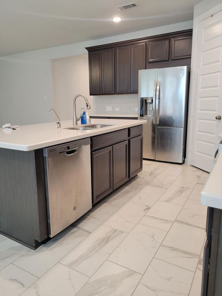 Located in Meridiana, 1-story, 4 bedroom, 3 full bath, built 2020, approx 2298 sqft, 2 car attached garage with opener, tile throughout common areas, carpet in bedrooms only, kitchen open to the family room, gas stove, d/w, built in microwave, and fridge, fridge is not warranted, formal dining room, primary bath has double sinks, separate shower and tub, full bath in front hall way between two bedrooms, fourth bedroom with full bath, ceiling fans throughout, utility room inside with w/d hookups, rear covered patio with fenced yard, house has a sprinkler system, tankless hot water, and water softener, EV charging station in the garage for tenant use, but is not warranted, Alvin ISD, no pets preferred, owner may consider small pet with deposit.