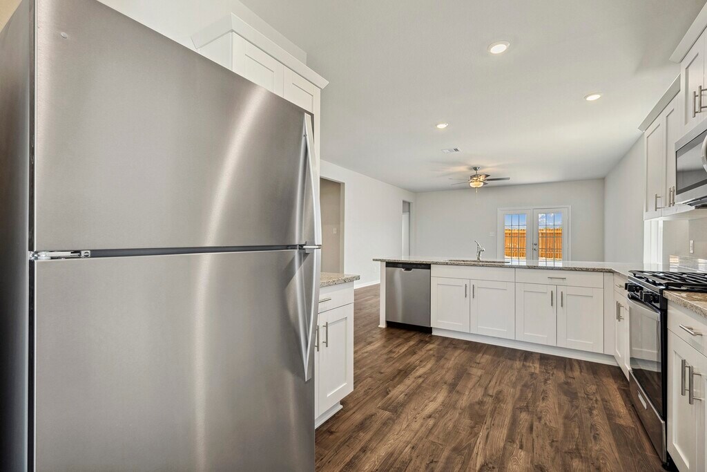 This home was built with entertainment in mind. It's an open and spacious one-story home which features a private dining room,a modern upgraded kitchen,a large family room,a fenced-in backyard and an extended covered patio,additionally the kitchen features some stunning white cabinets with brushed nickel knobs,a full suite of whirlpool appliances including a refrigerator and built-in microwave,recess LED lighting,polished granite countertops and luxury vinyl plank flooring. In the master suite,you will find a spacious En-suite which boasts a separate large soaking tub and step-in shower. There are two additional bedrooms which share a tub and shower combo. Our recreational park is sure to have something for everyone,it features a zip-line,splash pad,picnic area,walking/jogging path and a variety of slides. Come Visit our Community Today! MLS# 69680499
