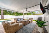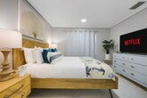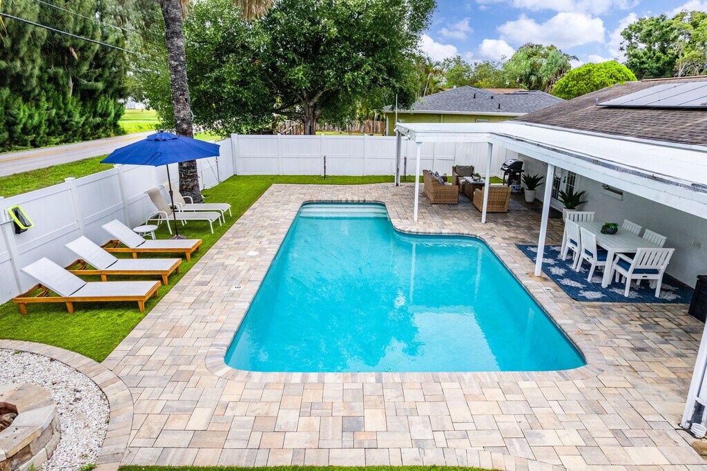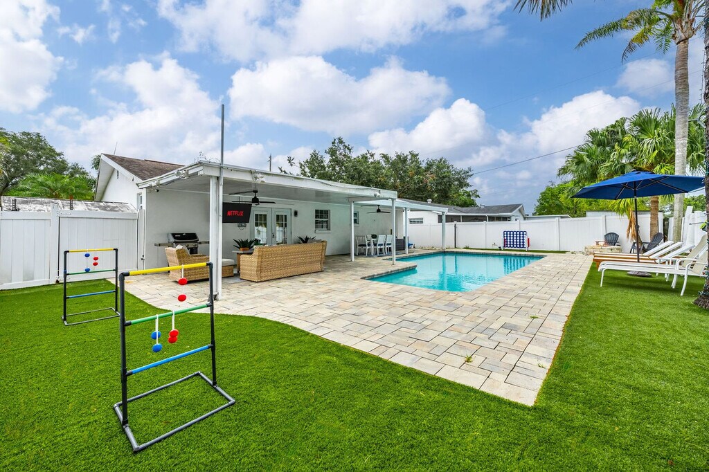 This 3-bedroom home is perfectly situated in Pinellas Park, FL, offering everything you need for an amazing vacation. Feel at home with amenities like a heated private pool, fire pit, outdoor patio with dining and TV, BBQ grill, and ample parking. The home is family and kid-friendly, featuring a fully stocked kitchen, washer and dryer, and high-speed Wi-Fi. Welcome to your perfect Florida escape! This inviting and modern 3-bedroom, 2-bathroom home in sunny Pinellas Park, FL offers the ideal blend of comfort, convenience, and style. Featuring a refreshing heated pool, open-concept living spaces, a fully equipped kitchen, and thoughtfully designed bedrooms, this cozy retreat is perfect for families, couples, or small groups. Step outside to enjoy the sun-soaked patio, take a dip in the private heated pool, or fire up the BBQ for relaxed outdoor dining. Inside, you'll find a bright and airy layout with cozy living areas, smart TVs, and lightning-fast 1 Gbps internet—ideal for streaming, remote work, or staying connected. The heated pool is available for an additional fee of $100 per night. The pool can be heated to about 20-25 degrees above the ambient temperature, and it's recommended to heat the pool between October to May. A 3-day notice is required before arrival if you'd like the pool heated. The pool must be heated for the entirety of your stay. Centrally located, you're just 20 minutes from Tampa, Downtown St. Pete, Clearwater, and the beach, putting you close to top attractions, shopping, and dining. Nearby attractions include Sawgrass Lake Park, Freedom Lake Park, Tampa Bay Automobile Museum, and Helen S. Howarth Community Park. Enjoy dining at local favorites like Campanella’s Italian Restaurant & Pizzeria, BJ’s Restaurant & Brewhouse, Da Sesto Italiano Ristorante e Vino, Cajun Cafe on the Bayou, and Victor’s Kitchen. Renting a car or using rideshare services like Uber and Lyft are convenient options for exploring the area. Check-in is at 4pm and check-out is at 10am. No pets are allowed. An exterior camera is installed solely to monitor the cleaning team for quality and security purposes. No parties are allowed, and violations may result in immediate termination of the stay. Parking is available in the driveway for up to 4 cars, but street parking is not allowed. Guests must be 21 years or older to book this property. A guest verification process is required within 48 hours of booking confirmation, including signing a Rental Agreement and providing a valid ID and matching credit card before check-in. A non-refundable $60 damage waiver is required, covering accidental damage during your stay, as long as it is reported prior to check-out. The home offers lightning-fast 1 Gbps internet, making it ideal for streaming, remote work, or staying connected. [SI]